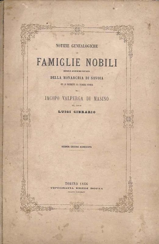 Notizie genealogiche di Famiglie Nobili degli antichi stati della Monarchia di Savoia cui si premette la tragica storia di Jacopo Valperga di Masino. (Seconda edizione accresciuta).