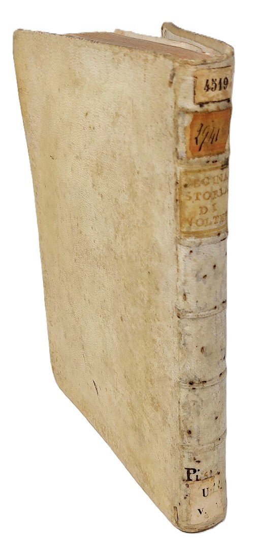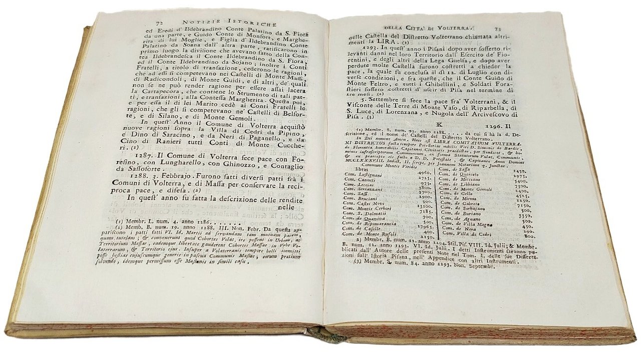 >in-4, pp. XXVIII, 331, legatura coeva p. perg. rigida, dorso a nervi con tit. oro. Frontesp. a stampa rossa e nera con vignetta, grandi iniz. e fregi silogr. Precedono la dedica al ''Senato, e Popolo di Volterra'' e una lunga prefazione di F. Dal Borgo. Prima edizione di opera rara e ricercata. ''Quest'opera è stimabile, perché è tutta sopra irrefragabili documenti, ed arriva dalla fondazione di Voltrerra fino al 1530...Le serie dei Podestà, che comincia dal 1093, e arriva al 1470, e quella dei Capitani del Popolo dal 1281...che seguita fino agli ultimi tempi... Le annotazioni poi portano principalmente lo schieramento di alcuni punti d'Istoria Pisana...'' (Moreni I, 242). Ottimo esempl. Lozzi 6493. Platneriana p. 436. Coleti p. 286.
