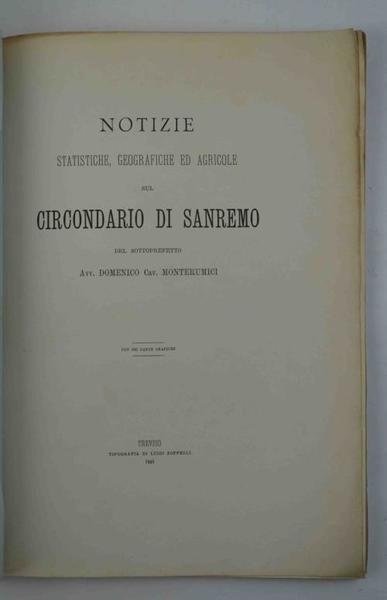 Cm. 27, pp. vii (1) 89 (3). Con 5 grandi carte ripiegate fuori testo. Bross. orig. Esemplare genuino ed in ottimo stato di conservazione. Edizione originale, assai rara di questo dettagliato quadro statistico-economico della zona di Sanremo.