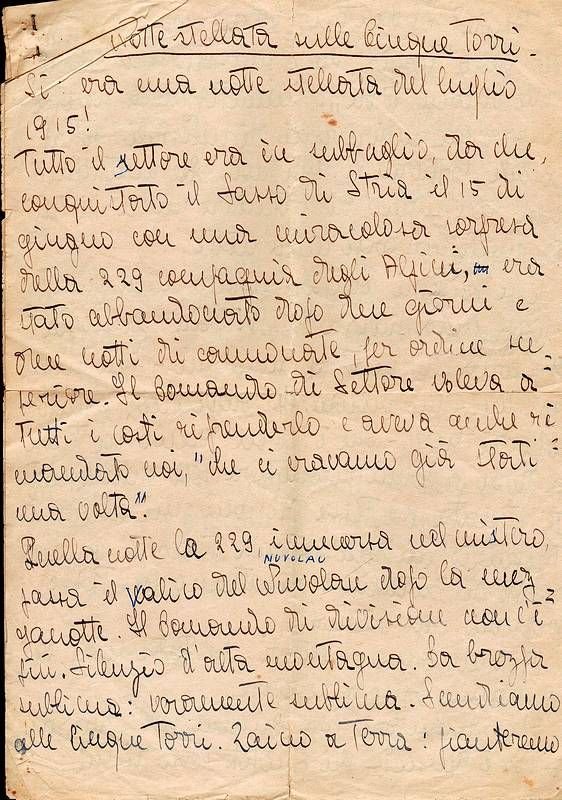 Lettera autografa firmata, tre fogli per 4 facciata scritte con stilografica in calligrafia leggibile. Si parla del bivacco, della conquista del Sasso di Stria e di tre vittime raccolte nel cimitero stese su tavole e coperte dal Tricolore. Carta povera con segni di piegature. -(Cinque Torri, Sasso di Stria, Valico del Nuvolau ed altre località furono teatro di aspre battaglie tra truppe italiane e austro-ungariche durante la Grande Guerra).