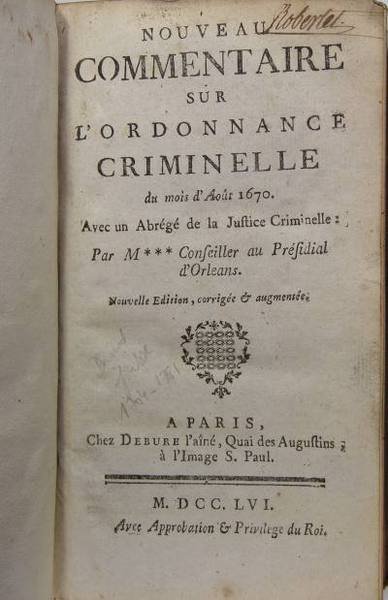 Nouveau commentaire sur l’ordonnance criminelle du mois d’Août 1670. avec un abrégé de la Justice criminelle.