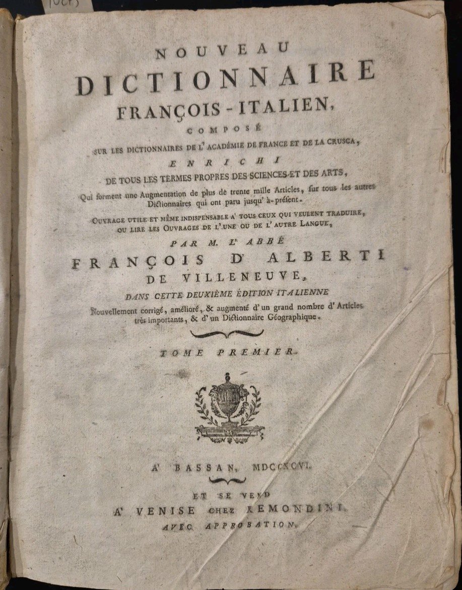 NOUVEAU DICTIONNAIRE FRANCOIS ITALIEN TOME PREMIER di De Villeneuve 1796 antico
