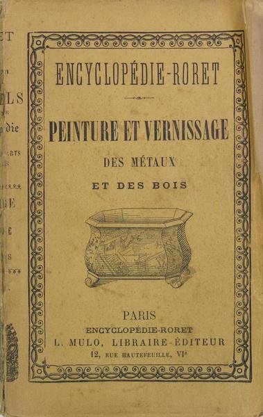 Nouveau manuel complet de PEINTURE ET VERNISSAGE DES METAUX ET DES BOIS contenant la composition et l’emploi des couleurs les plus appropriées à ces industries ; la préparation des métaux à décorer ; l’application des vernis ; l’imitation sur métaux des pierres précieuses, et des bois indigènes et exotiques ; l’ornementation des articles de ménage, etc ; suivi de la reproduction des laques du Japon