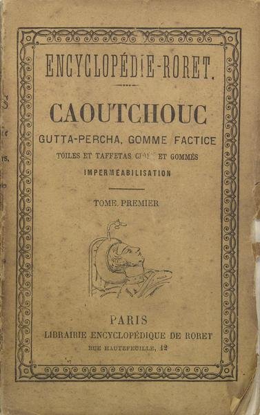 Encyclopédique de Roret, 1880. 2 volumes in/12 brochés, couvertures illustrées d’une vignette, 2 planches rempliées in-fine, 292 p. & 228 p., 36 p. de catalogue. Dos oxydé ; auréole claire sur la bordure supérieure des 10 derniers feuillets du tome 1. et les 10 premiers du tome 2. Histoire du caoutchouc naturel : lieux de production, végétaux producteurs, extraction, composition et propriétés, régénération du caoutchouc, agglomération ou pétrissage, usage, coloration, préparation des dissolutions, fabrication des feuilles de caoutchouc, des fils, objets moulés, balles et ballons, tissus élastiques, tubes et tuyaux, tissus imperméables, vêtements en caoutchouc, pâtes, huiles et graissage, mastics, caoutchouc vulcanisé, : propriétés, pratique, usages, caoutchouc durci.