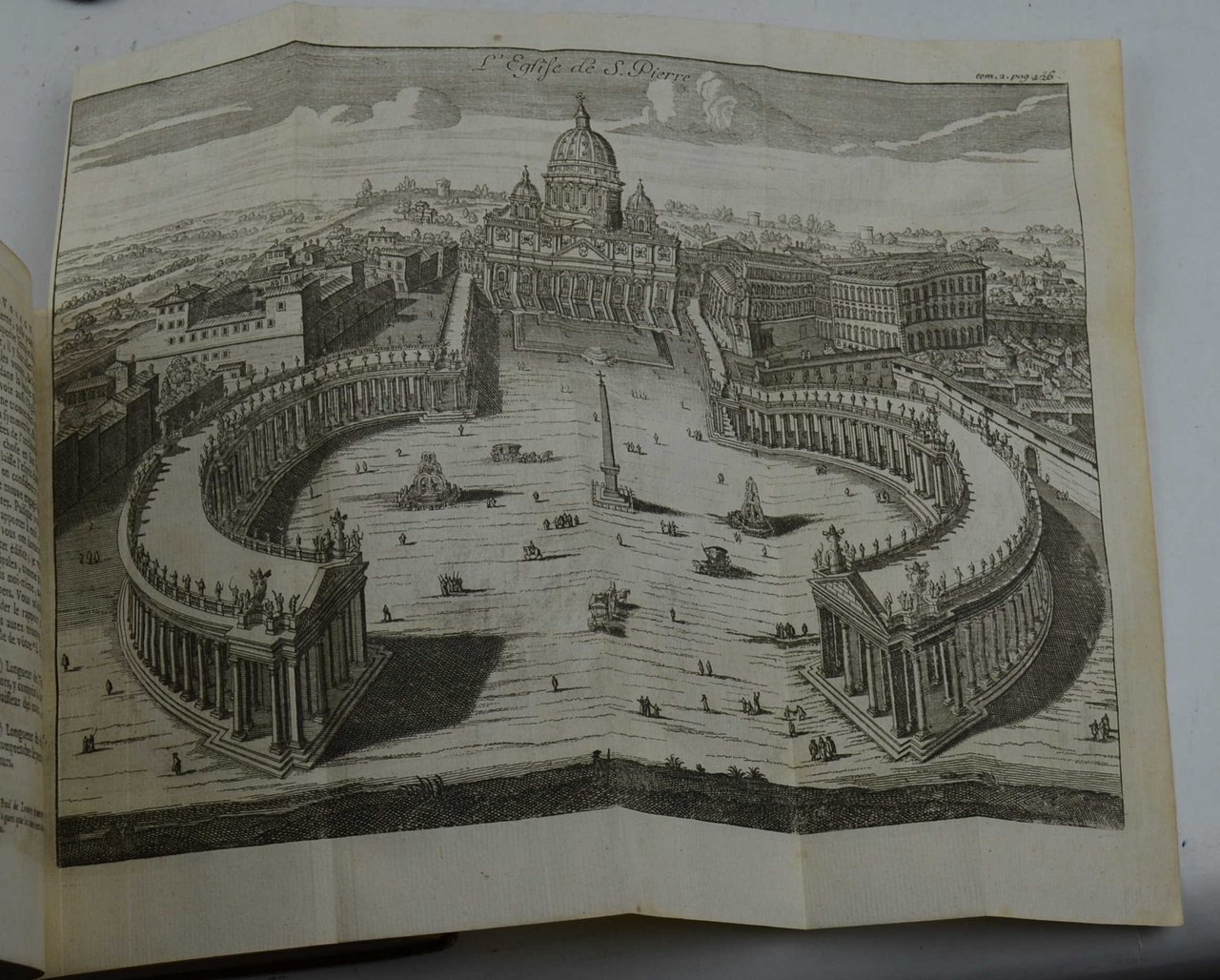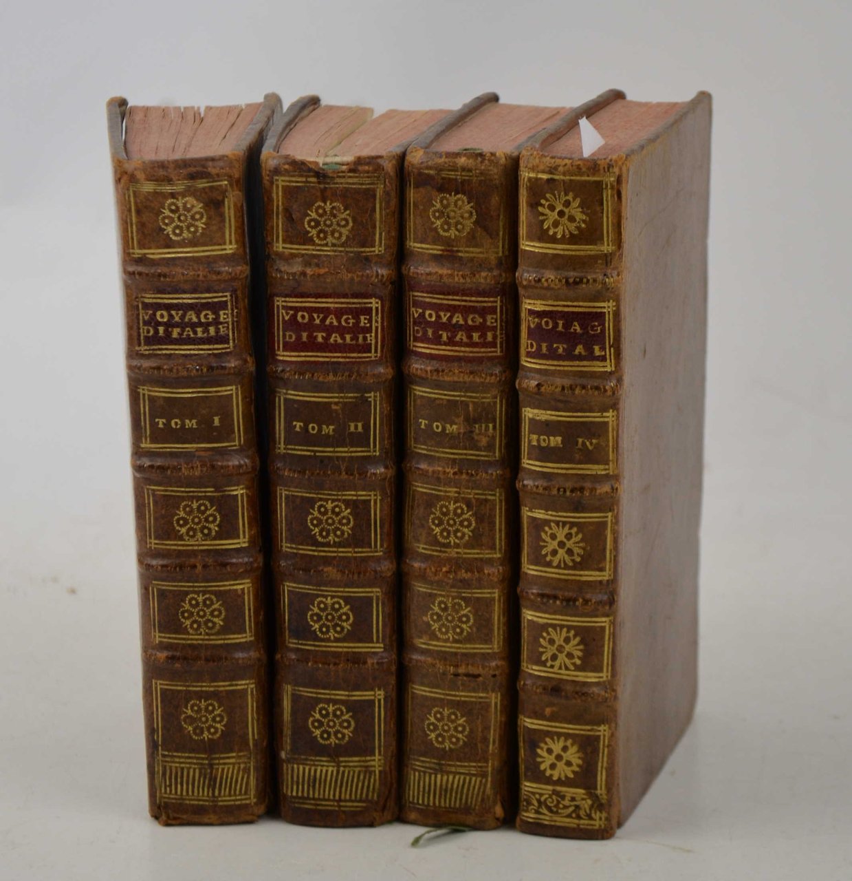 Quattro volumi di cm. 16,5, pp. 1.500 ca. complessive. Frontespizi in rosso e nero, antiporta figurata al primo volume e 83 tavole incise in rame, molte delle quali ripiegate fuori testo. Legatura coeva in piena pelle, dorsi a nervi con titoli e ricchi fregi in oro, tagli rossi e sguardie marmorizzate. Riparazioni al verso di alcune delle tavole ripiegate, uno strappetto al margine di due carte del quarto volume con perdita di alcune lettere e tavole con inchiostratura talvolta un po' debole, peraltro esemplare genuno e ben conservato. Certamente una delle più classiche descrizioni dell'Italia del tempo, abbondantemente celebrata dalle bibliografie tematiche. Si dice che fu la guida preferita per Goethe, De Brosses e Montesquieu nelle loro peregrinazioni italiane. Il quarto volume titola: Remarques sur divers endroits d'Italie par Mr Addisson pour servir au Voyage de Mr. Misson.