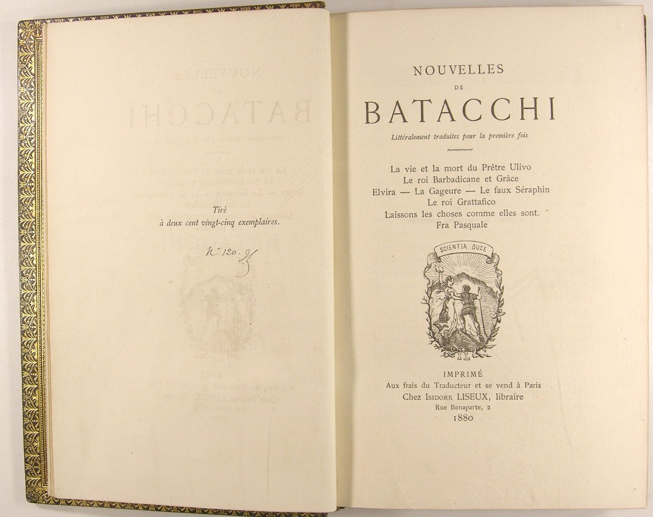 Paris, chez Isidore Liseux, 1880. In/8 reliure plein maroquin marron signée F. Foch, dos à nerfs à titre doré, roulette intérieure, doré sur trois tranches. Ex-libris. Tirage limité à 225 exemplaires numéroté, 120/225. Contient : La vie et la mort du Prêtre Ulivo - Le roi Barbadicane et Grâce - Evira - La Gageure - Le faux Séraphin - Le roi Grattafico - Laissons les choses comme elles sont - Fra Pasquale.