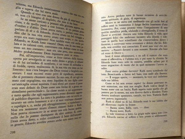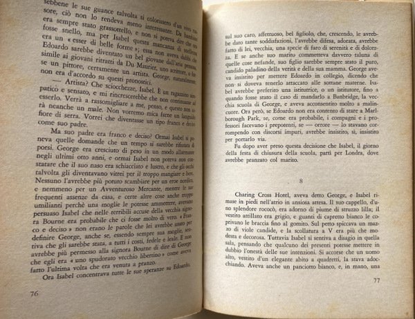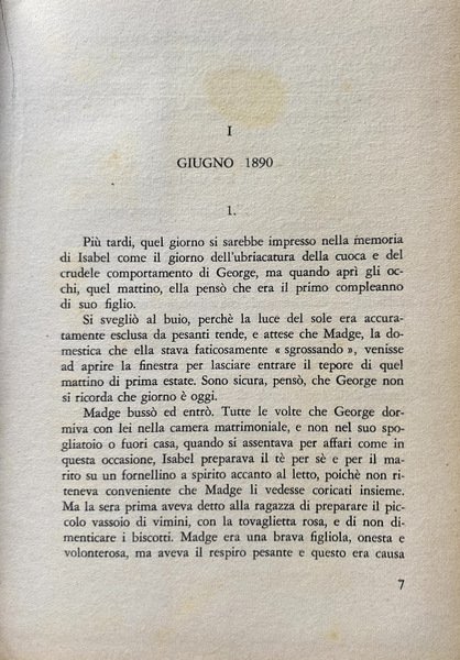 GIUGNO 1890 Più tardi, quel giorno si sarebbe impresta nella memoria di Isabel come il giorno dell'ubriacatura della cuoca e del crudele comportamento di George, ma quando aprì gli occhi quel mattino, ella pensò che era il primo compleanno di suo figlio. Si svegliò al buio, perché la luce del sole era accuratamente esclusa da pesanti rende, e attese che Madge, la domestica che ella stava faticosamente sgrassando, venisse ad aprire la finestre per lasciare entrare il tepore di quel mattino di prima estate. Sono sicura, pensò, che George non si ricorda che giorno è oggi. Madge bussò ed entrò. Tutte le volte che George dormiva con lei nella camera matrimoniale, e non nel suo spogliatoio, o fuori casa, quando si assentava per affari come in queste occasione, Isabel preparava il tè per sé e per il marito su un fornellino a spirito accanto al letto, poiché non riteneva conveniente che Madge li vedesse coricati insieme. Ma la sera prima aveva detto alla ragazza di preparare il piccolo vassoio di vimini, con la tovaglietta rosa, e di non dimenticare i biscotti. Madge era una brava figliola. onesta volenterosa, ma aveva il respiro pesante e questo era causa.