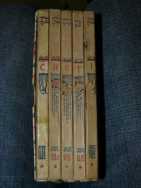 5 voll. in cofanetto, numerose illustrazioni n.t. in nero di Lentini, legastura in mezza pergamena con piatti in carta varese. I dorsi in sequenza formano il nome dell'autore e dei disegni liberty. Graziosa edizione di 1000 esemplari.