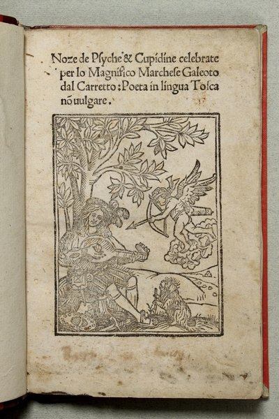 Prima edizione estremamente rara della celebre commedia ispirata alla favola di Apuleio ed uno dei primi testi ad immaginarne il mito rappresentato sulla scena in volgare italiano. "Le Noze, scritte verso il 1502-1503, sono una parafrasi polimetrica della nota favola di Apuleio (Met., IV-VI), con lo scioglimento dell'originario tessuto narrativo in recitativo dialogato e melodrammatico e corali cantati, e rappresentano un primo tentativo di poesia "barbara" (Sanesi). “Depuis les Noze de Psyche & Cupidine de Galeotto del Carretto, vers 1520, jusqu’à la « tragédie-ballet » de Molière, Corneille, Quinault et Lulli, jouée en 1671, Psyché est présente sur les scènes européennes : intermèdes, drames musicaux, masques, ballets de cour… tous les genres théâtraux s’emparent d’elle, avec une présence constante de la musique, et une remarquable constante de la dimension spéculaire.” (Guillaume Berthon). Uscita senza note tipografiche l’edizione fu variamente attribuita sia alla stamperia milanese di Alessandro Minuziano, che alla tipografia di Niccolò Zoppino e Vincenzo di Paolo attiva a Venezia. Notevoli, oltre al pregevole legno iniziale, il corsivo e l'impaginazione, ricalcati sul modello dei celebri ottavi aldini.