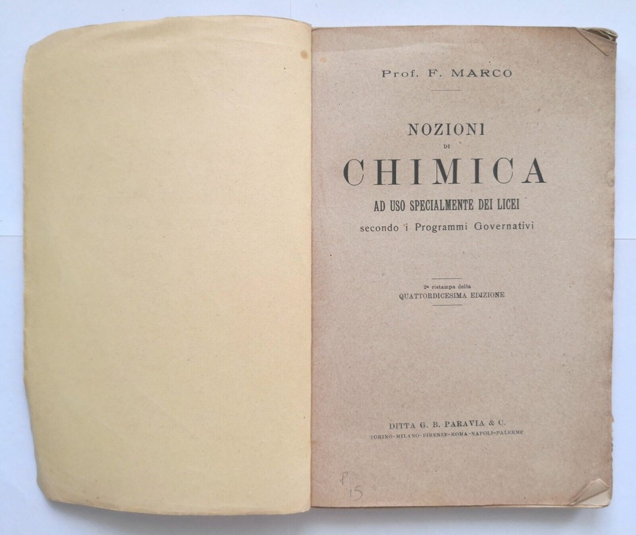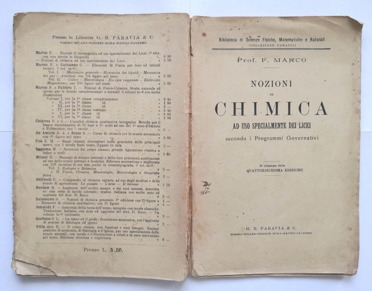 NOZIONI DI CHIMICA F Marco 1918 Paravia Libro ad uso dei licei scolastico