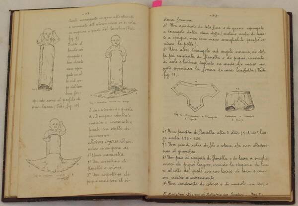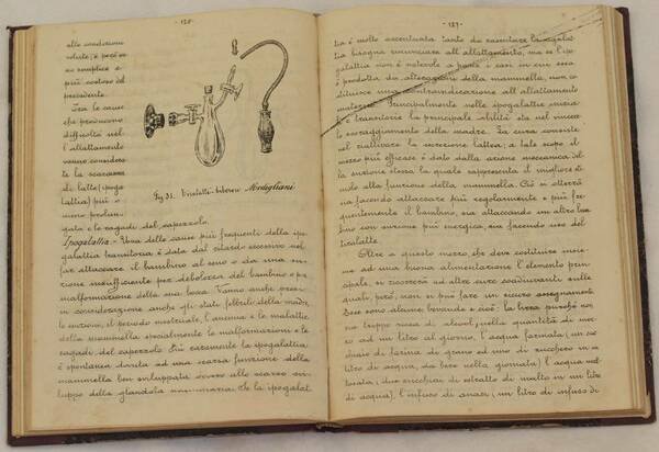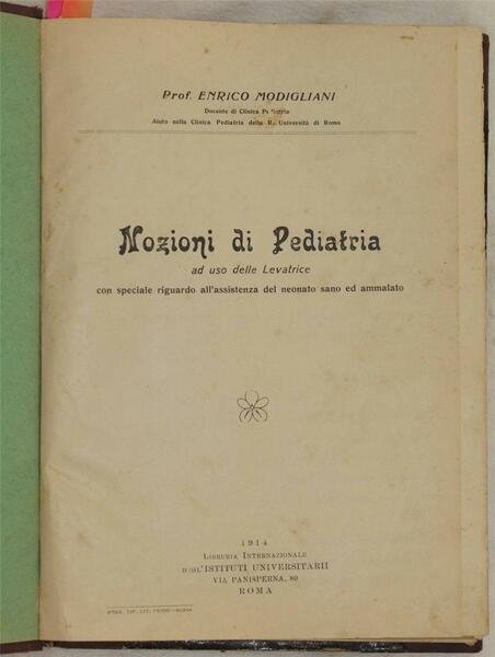 In 8. Dim. 25x18 cm. Pp. 256+74. Rara raccolta di appunti del 1914 delle lezioni di pediatria del Prof. Enrico Modigliani (1877-1931) appartenente alla Comunità ebraica di Roma, pediatra docente della Clinica di Pediatria. Modigliani dedicò gran parte della sua carriera ai disturbi della nutrizione nei bambini, alla pediatria sociale e malattie infettive. Ampia parte del volume, ad uso della levatrice, è dedicato agli alimenti, nutrizione, allattamento e malattie. Alla fine del volume lezioni di ostetricia e ginecologia del 1912-13 appendice alle lezioni del 1911-12. Alcune illustrazioni all'interno. Gli appunti sono stati redatti in copia manoscritta. Pagina 111 mancante o molto probabilmente errore di numerazione. In buone condizioni. Copertina in mezza tela in buone condizioni generali con lievi usure ai margini e dorso. Legatura in buone condizioni con qualche rottura. All'interno le pagine si presentano in buone condizioni con fioriture. Scarce collection of lessons of pediatry of Prof. Enrico Modigliani (1877-1931) belonging to jewish community, teacher pediatry of Clinica di Pediatria. Modigliani dedicated great part of his carreer to problems of nutrition of children, social pediatry and infectuos deseases. Wide part of volume, for the usage of midwife, is dedicated to food, nutrition, nursing and deseases. At the end of the volume lessons of obstetrics and ginecology of 1912-13 appendix of lessons of 1911-12. Some illustrations inside. The notes have been written in manuscripted copy. Page 111 is missing or probably is a fault in numbering. In good conditions. Half cloth cover in good general conditions slightly worn in the edges and spine. Binding in fair conditions with some cracks. Inside pages are in good conditions with foxings.