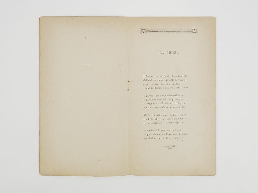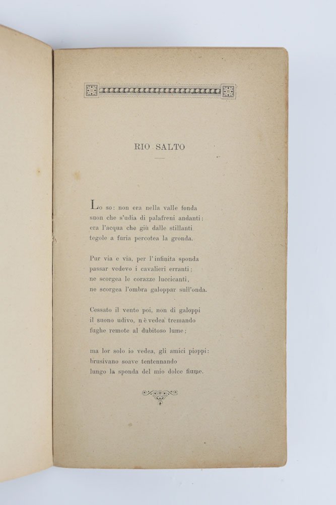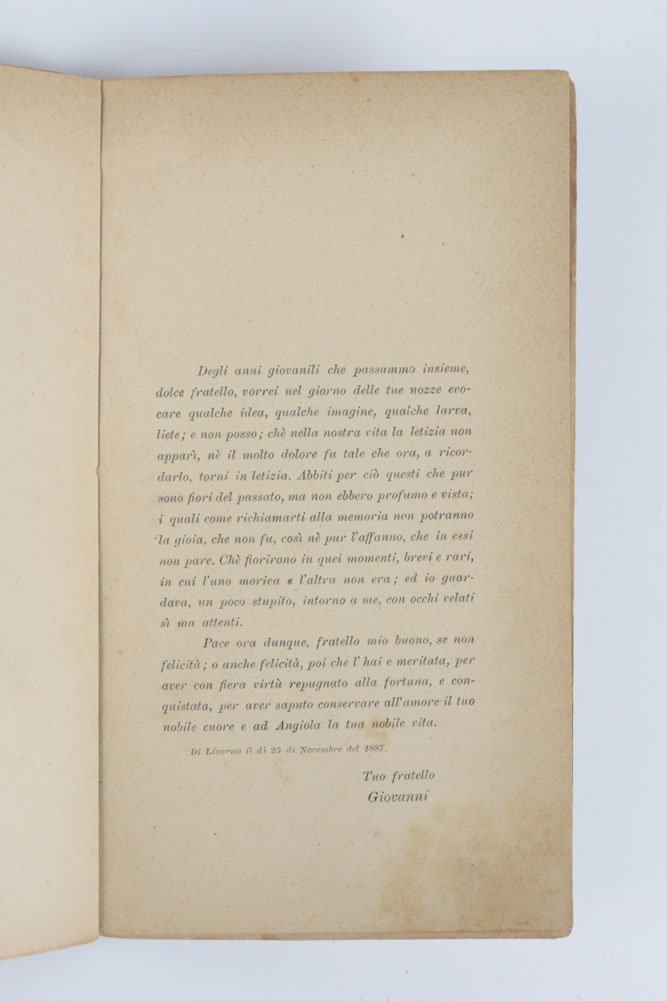 LIBROEdizione originale.Alcune lievi bruniture alle carte, nel complesso in ottime condizioni.Rarissima plaquette dedicata da Pascoli al fratello Raffaele in occasione delle sue nozze con Angiola Quadri: ne furono stampati 25 esemplari, come indicato in fine. Il libretto si apre con un’affettuosa e accorata dedica/prefazione datata 25 novembre 1887, in cui Pascoli augura allo sposo «Pace [.] se non felicità; o anche felicità, poi che l’hai meritata». Seguono otto sonetti, di cui quattro del tutto inediti fino ad allora: tutti confluiranno nella seconda edizione di «Myricae» del 1892. «Lo stornello» è in prima edizione e sarà pubblicato, l’anno successivo, sul settimanale bolognese «La Patria» del 22 gennaio. «Rio Salto», invece, era già uscito, una decina di anni prima, sul mensile fiorentino «I Nuovi Goliardi» del giugno-luglio 1877, con il titolo differente di «Lo so.». «La chiesa» è stampata qui per la prima volta ma, con l’ingresso in «Myricae», muterà titolo in «In chiesa». «Il maniero», come «Rio Salto» era già uscito a Firenze su «I Nuovi Goliardi», nell’aprile del 1877 e nello stesso mese fu pubblicato anche a Bologna, sul mensile «Pagine Sparse». «Il fonte» e «Il bosco» erano uscite pochi mesi prima delle nozze, il 24 luglio 1887, sul settimanale di Livorno «Cronaca Minima». Infine, vedono la luce qui per la prima volta le poesie «I sepolcri» e «Cavallino»: come le altre vengono accolte nella seconda edizione di «Myricae», ma «I sepolcri» sarà scartata dalla raccolta e non comparirà più nelle edizioni successive. La splendida e preziosa plaquette è abbellita da eleganti testatine e finalini. Rarissimo, 2 sole copie in Iccu (Biblioteca comunale dell'Archiginnasio - Bologna; Biblioteca nazionale centrale - Firenze).Pascoli, «Myricae», ed. Nava, pp. CCLXX-CCLXXX. Gambetti - Vezzosi, Rarità bibliografiche, p. 641.