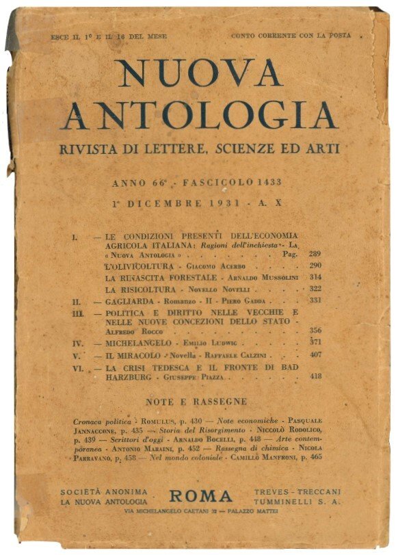 Mm. 248x170. Pp. XX, 289-472. C. lievemente ed marginalmente brunita, alcuni fascicoli risultano staccati dal corpo del testo. Brossura editoriale, cop. ant. staccata e dorso mancante. Prima edizione di questa uscita del periodico mensile 'Nuova antologia': anno 66 fascicolo 1433, 1° Dicembre 1931.