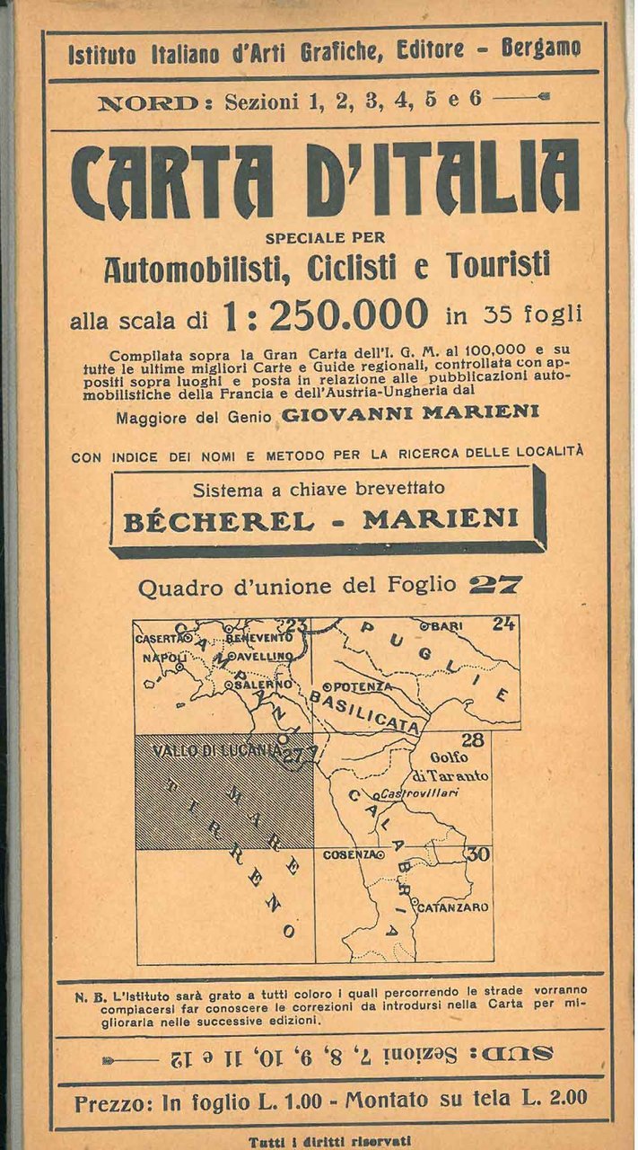 Nuova carta stradale d'Italia, speciale per automobilisti, ciclisti, turisti. Scala 1:250000. Foglio 27, contiene: Vallo di Lucania - Golfo di Policastro - Mare Tirreno