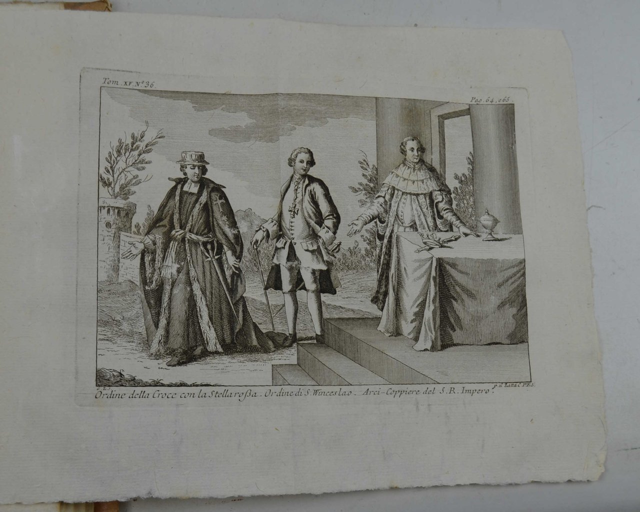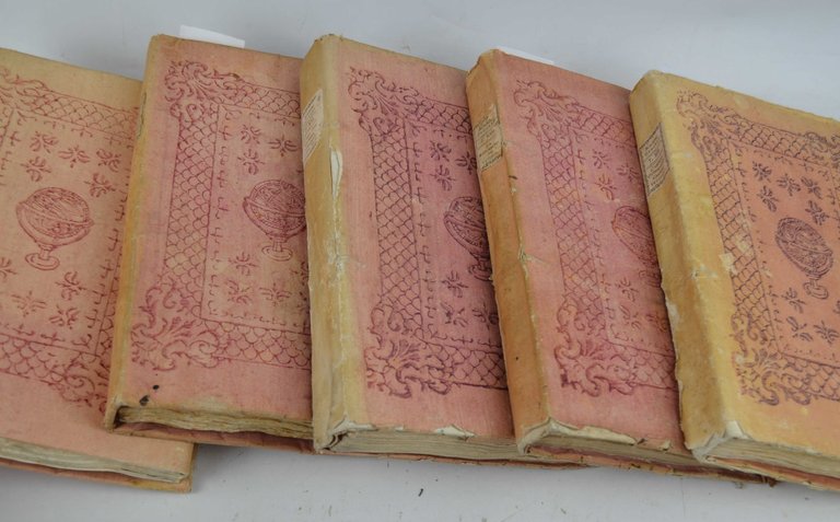 Trentacinque volumi di cm. 24, pp. 10.000 ca. complessive. Vignette a ciascun frontepizio, 2 tabelle e 43 tavole f.t incise in rame (quasi tutte ripiegate) tra cui alcune antiporte ed il ritratto di Pio VI. Bella legatura originale omogenea in cartonato ricoperto in carta dipinta con immagine di un astrolabio ai piatti. Titoli al dorso su etichetta a stampa. Solo alcuni volumi con tracce d'uso esterne e qualche mancanza alla ricopertura, peraltro bell'esemplare, genuino, fresco, marginoso e stampato su carta di ottima qualità. Opera celebre e non comune a reperirsi completo di tutti i volumi e nella parte iconografica come il presente esemplare. La collazione risulta assai complessa, ma il presente è stato confrontato con diversi esemplari (e con le copie digitalizzate) e risulta assolutamente completo.