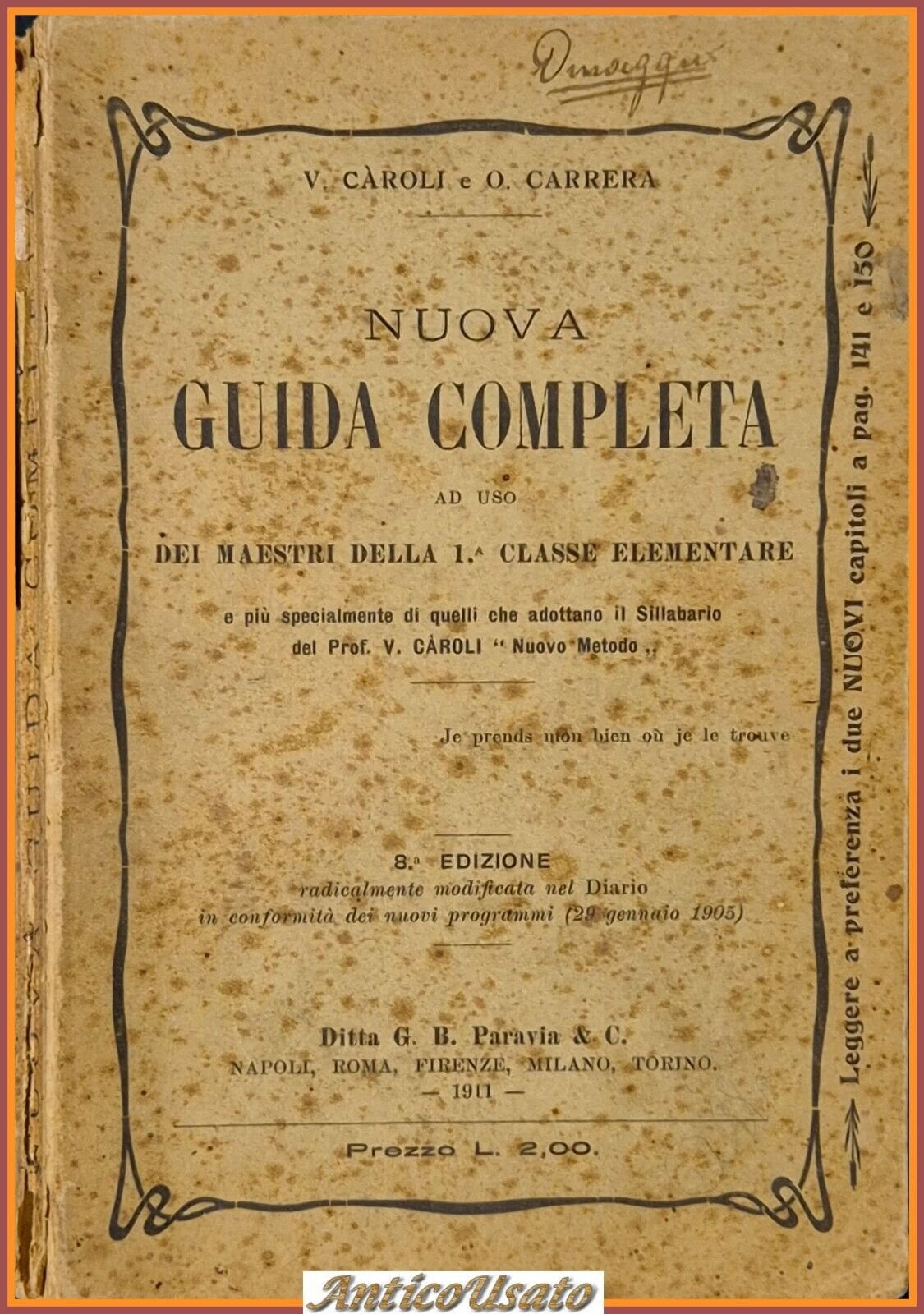 NUOVA GUIDA COMPLETA ad uso dei maestri della 1° classe elementare e più specialmente di quelli che adottano il sillabario del Prof. Caroli "Nuovo Modo" di V.Caroli e O. Carrera.