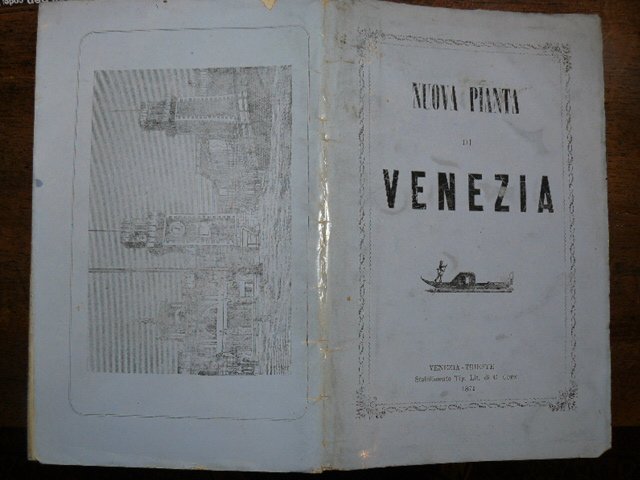 Bella pianta della città di Venezia in litografia a colori, misure: cm. 73 x 58 ripirgata e custodita in in una cartella in brossura editoriale con vedutina al piatto inferiore. Donata dall'editore a Adolfo Genovesi.