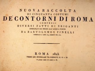 NUOVA RACCOLTA DI CINQUANTA COSTUMI DE' CONTORNI DI ROMA compresi diversi fatti di briganti disegnati ed incisi all'acqua forte. cominciati l'anno 1819 compiti nel 1822. Roma, Presso Gio. Scudellari., 1823.