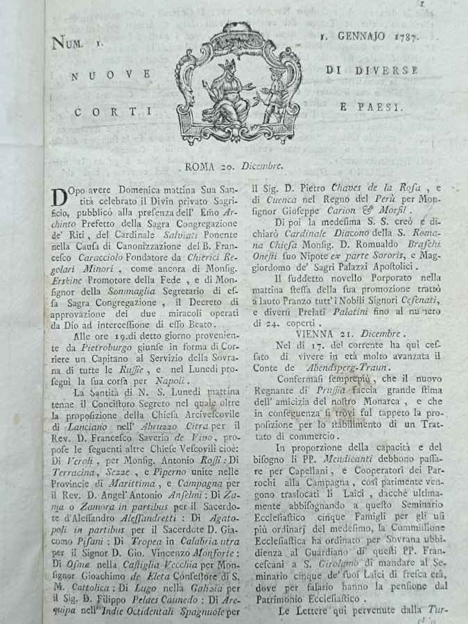 In-4° (cm. 22,9), legatura successiva in piena similpelle verde, dorso liscio con titolo in oro su doppio tassello bordeaux (piatti bruniti, lievi tracce d'uso e piccola mancanza alla cuffia superiore); pp. 424 in barbe, in buono stato (lievi fioriture sparse, una gora a poche carte, rare tracce d'uso e macchiette). Raccolta di 53 fascicoli per <span style="font-size: 13.333333px;">l'annata del 1</span>787 della Rivista settimanale; qui il n. 49 (corretto con inchiostro antico) è in realtà una ripetizione del n. 30, che quindi compare due volte. Il periodico venne fondato dalla famiglia Agnelli, a cui si deve l'apertura della prima tipografia nel territorio ticinese, e fu uno dei primi giornali settimanali stampati in Europa. Raro, come tutte le Gazzette a fogli volanti. Buon esemplare. (NJ2)
