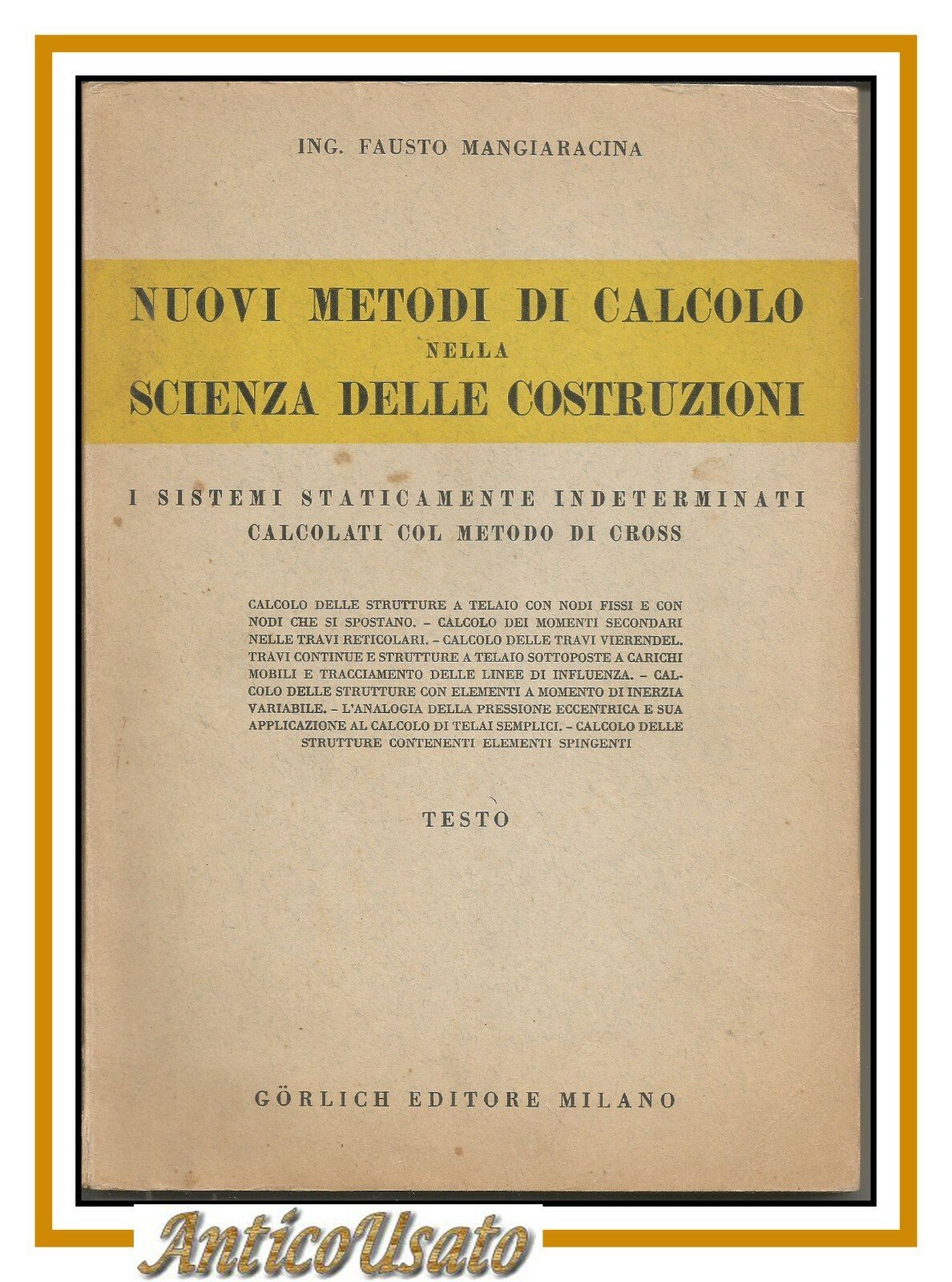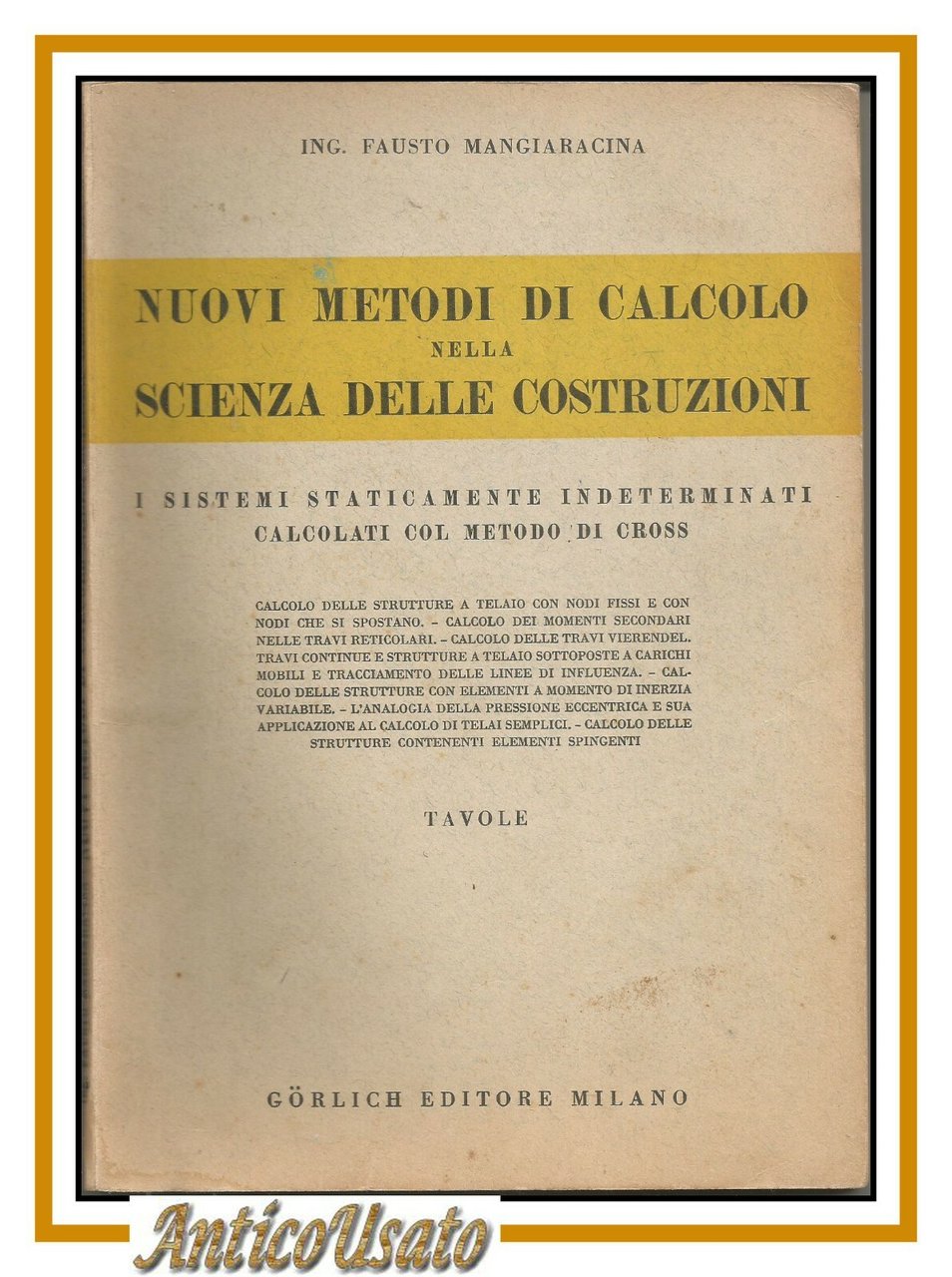 NUOVI METODI DI CALCOLO NELLA SCIENZA DELLE COSTRUZIONI 2 volumi di Fausto Mangiaracina. Gorlich editore 1951. Volume 1 testo, volume 2 tavole. VII, 144 pagine di testo e 315 figure in bianco e nero nelle tavole. Copertine editoriali in brossura. Stato di conservazione: buono (pagine ingiallite alcune sottolineature a matita e a penna al testo)