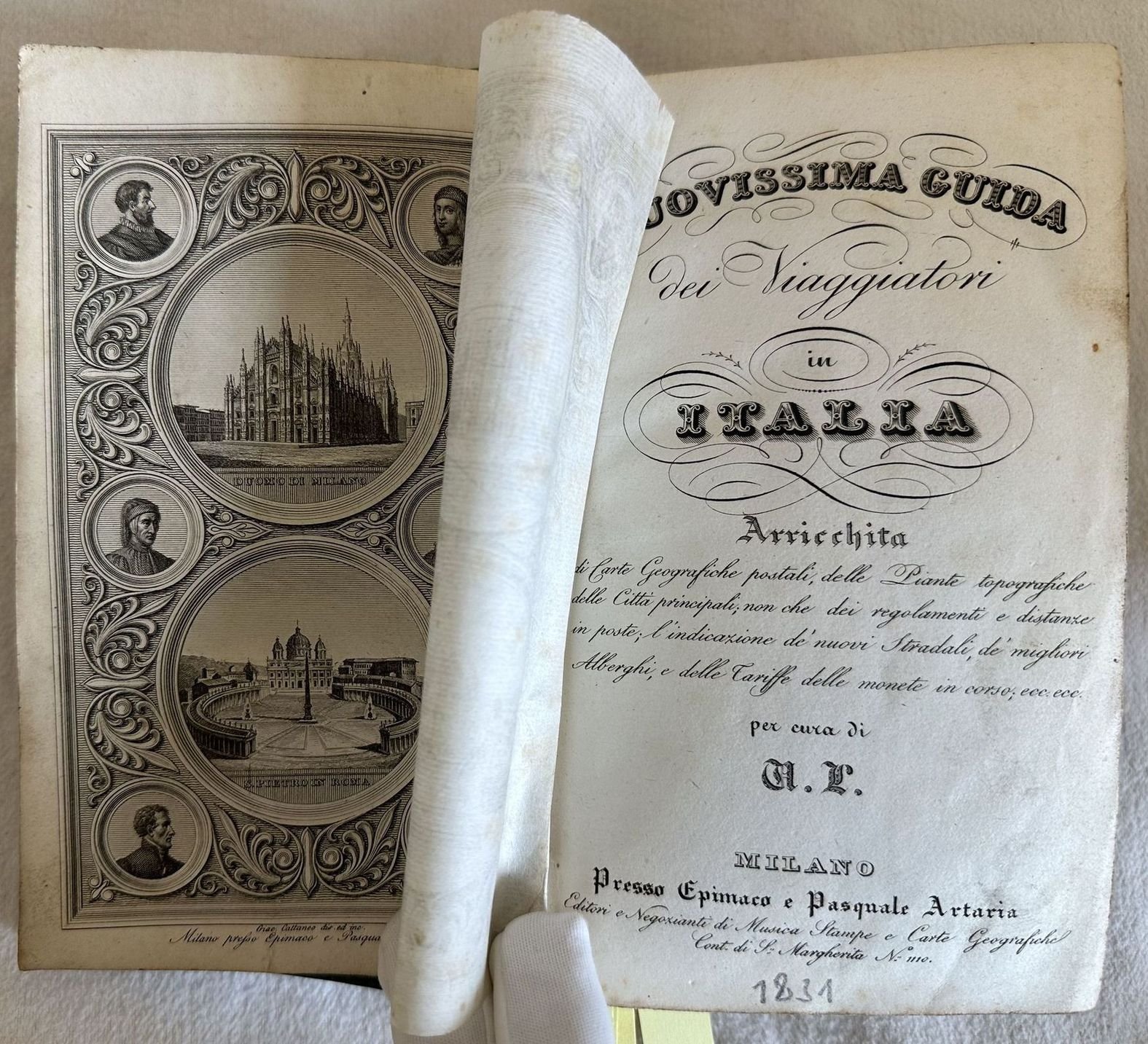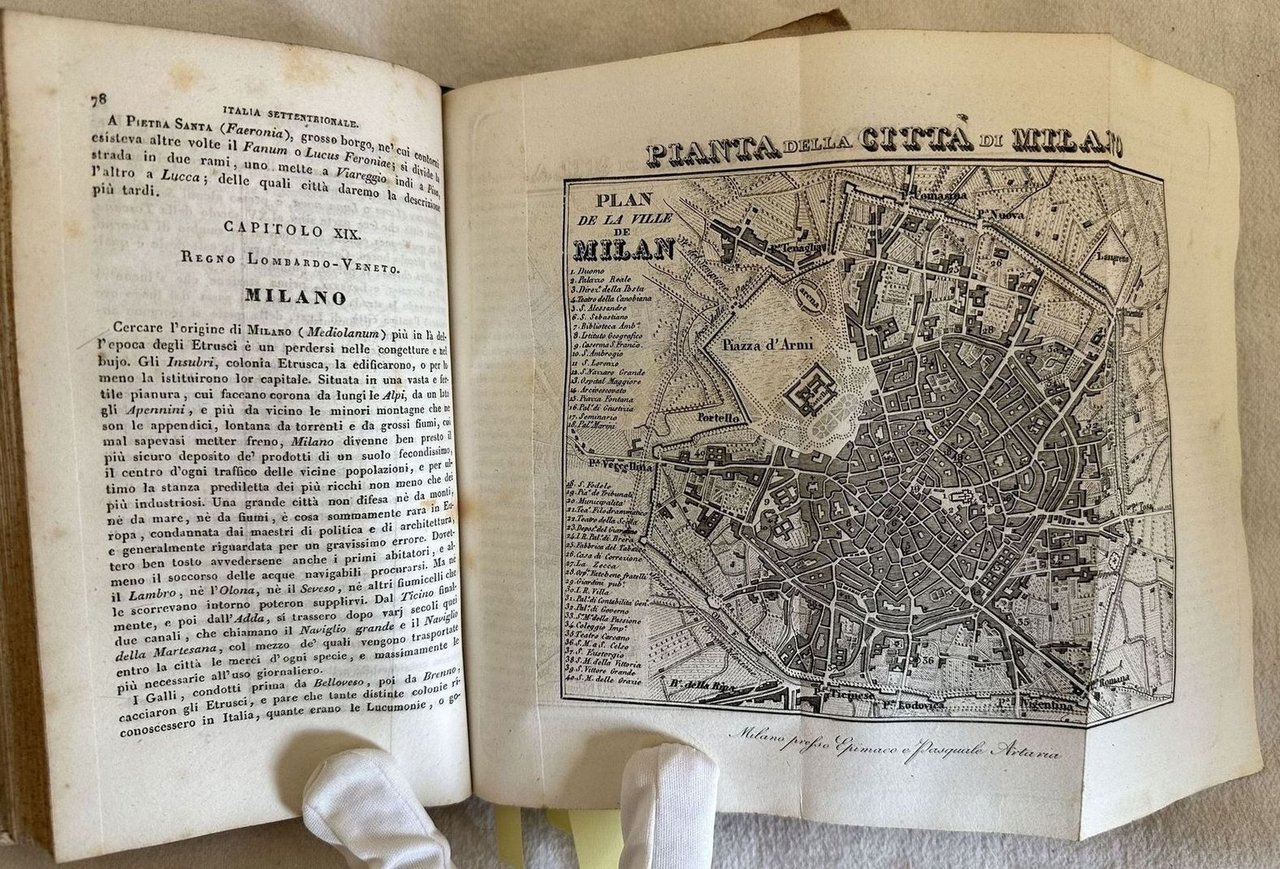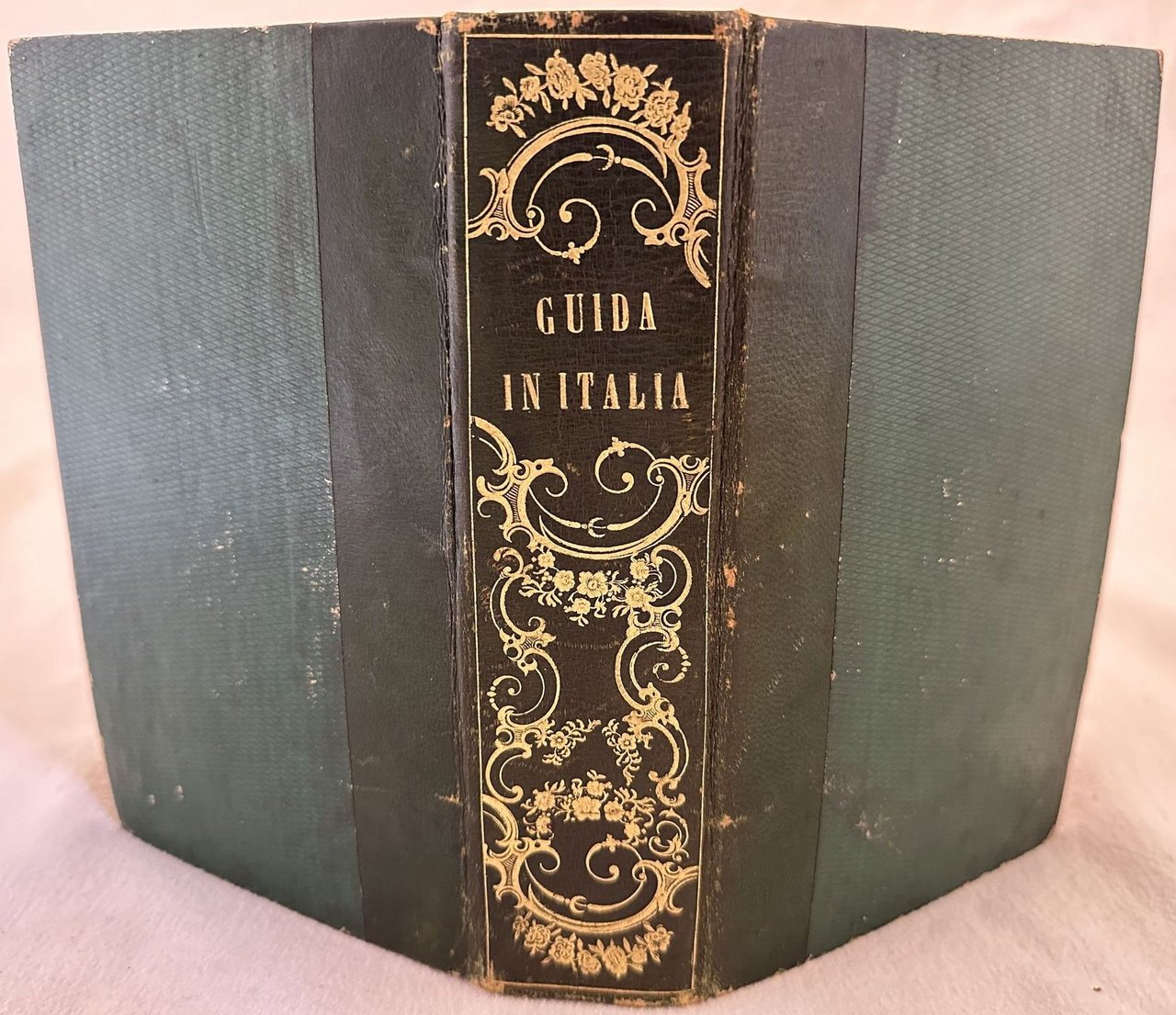 Bella edizione del 1831 di questa celebre guida d'italia riccamente illustrata. All'interno frontespizio figurato e ventuno tavole fuori testo tra cui la bella mappa dell'Italia più volte ripiegata. Inoltre carte stradale di varie zone: Del passaggio delle Alpi e del Piemonte, da Milano a Venezia e Trieste, da Trieste a Vienna, da Milano a Venezia e da Milano a Firenze, da Bologna a Firenze e a Roma, da Firenze a Livornon e all'Isola d'Elba, da Roma a Napoli, da Napoli a Messina, Sicilia. Numerose le piante di città: Genova, Torino, Milano, Verona, Venezia, Trieste, Parma, Firenze, Roma, Napoli, Palermo ec. In ottime condizioni. Copertina in mezza pelle coeva con titolo e decorazioni in oro al dorso in ottime condizioni generali con lievi usure ai margini e dorso. Legatura in buone condizioni. All'interno le pagine si presentano in buone condizioni con fioriture. In 16. cm 18,5x11. Pp. CXXV+(1)+489+(3).Beautiful edition of 1831 of this famous guide to Italy richly illustrated. Inside figurated title page and 21 folded plates as the folded map of Italy. Street maps of different areas: Del passaggio delle Alpi e del Piemonte, da Milano a Venezia e Trieste, da Trieste a Vienna, da Milano a Venezia e da Milano a Firenze, da Bologna a Firenze e a Roma, da Firenze a Livornon e all'Isola d'Elba, da Roma a Napoli, da Napoli a Messina, Sicilia. Different plans of cities: Genova, Torino, Milano, Verona, Venezia, Trieste, Parma, Firenze, Roma, Napoli, Palermo ec. In very good conditions. Half leather coeval cover with gilted title and decorations in very good general conditions lightly worn in the extremities. Binding in good conditions. Inside pages are in good conditions with occasional foxing. In 16. cm 18,5x11. Pp. CXXV+(1)+489+(3).