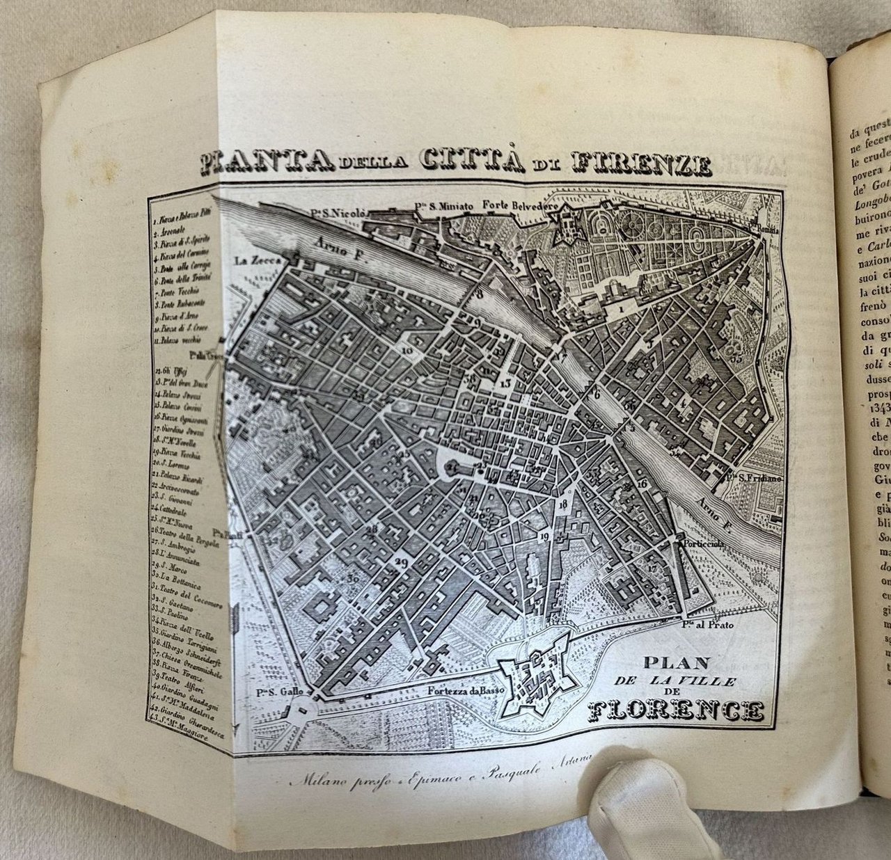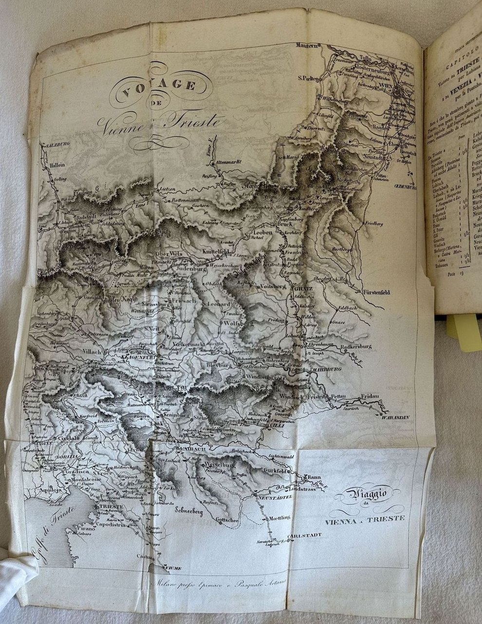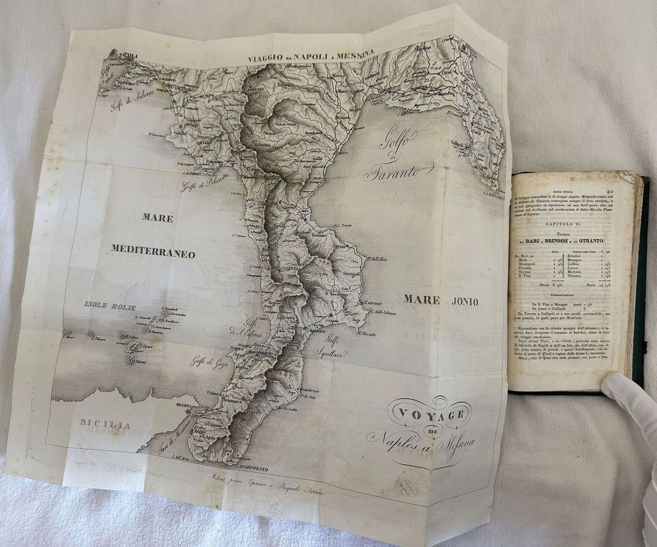 Bella edizione del 1831 di questa celebre guida d'italia riccamente illustrata. All'interno frontespizio figurato e ventuno tavole fuori testo tra cui la bella mappa dell'Italia più volte ripiegata. Inoltre carte stradale di varie zone: Del passaggio delle Alpi e del Piemonte, da Milano a Venezia e Trieste, da Trieste a Vienna, da Milano a Venezia e da Milano a Firenze, da Bologna a Firenze e a Roma, da Firenze a Livornon e all'Isola d'Elba, da Roma a Napoli, da Napoli a Messina, Sicilia. Numerose le piante di città: Genova, Torino, Milano, Verona, Venezia, Trieste, Parma, Firenze, Roma, Napoli, Palermo ec. In ottime condizioni. Copertina in mezza pelle coeva con titolo e decorazioni in oro al dorso in ottime condizioni generali con lievi usure ai margini e dorso. Legatura in buone condizioni. All'interno le pagine si presentano in buone condizioni con fioriture. In 16. cm 18,5x11. Pp. CXXV+(1)+489+(3).Beautiful edition of 1831 of this famous guide to Italy richly illustrated. Inside figurated title page and 21 folded plates as the folded map of Italy. Street maps of different areas: Del passaggio delle Alpi e del Piemonte, da Milano a Venezia e Trieste, da Trieste a Vienna, da Milano a Venezia e da Milano a Firenze, da Bologna a Firenze e a Roma, da Firenze a Livornon e all'Isola d'Elba, da Roma a Napoli, da Napoli a Messina, Sicilia. Different plans of cities: Genova, Torino, Milano, Verona, Venezia, Trieste, Parma, Firenze, Roma, Napoli, Palermo ec. In very good conditions. Half leather coeval cover with gilted title and decorations in very good general conditions lightly worn in the extremities. Binding in good conditions. Inside pages are in good conditions with occasional foxing. In 16. cm 18,5x11. Pp. CXXV+(1)+489+(3).