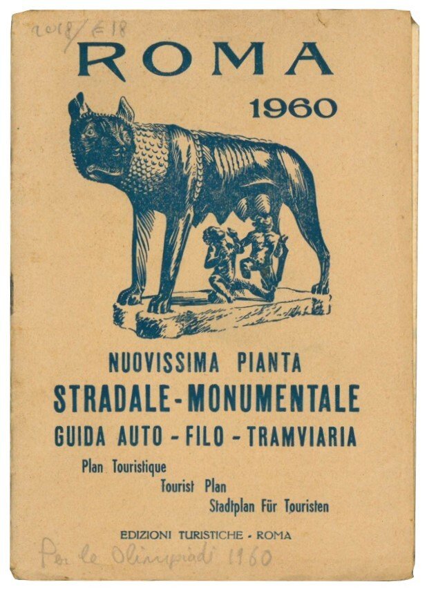 Mm. 176x124. Pp. [8], 1 c. di tav. ripiegata. Brossura editoriale con una carta stradale-monumentale ripiegata, creata in occasione delle Olimpiadi svolte a Roma nel 1960. Piccole mancanze marginali alla brossura.