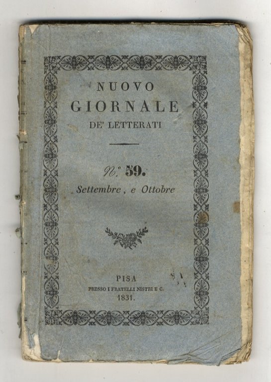 NUOVO giornale de' letterati. N. 59: settembre e ottobre 1831. [Parte prima: letteratura, scienze morali e arti liberali - parte seconda: scienze].