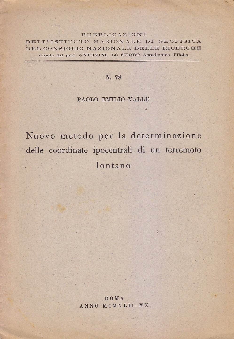 NUOVO METODO PER LA DETERMINAZIONE DELLE COORDINATE IPOCENTRALI DI UN TERREMOTO Pubblicazioni dell'Istituto Nazionale di Geofisica del CNR 1942 n° 78. 7 pagine.