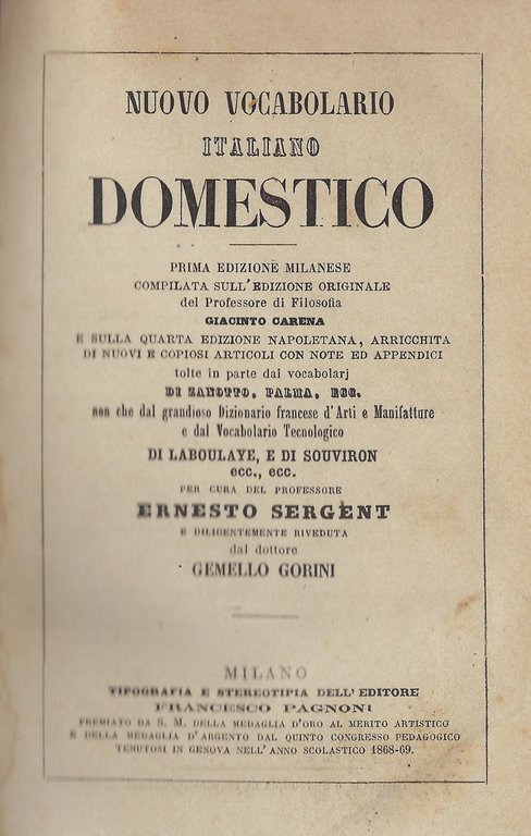 Prima edizione milanese compilata sull'edizione originale dal professore di filosofia Giacinto Carena e riveduta dal dottore Gemello Gorini.