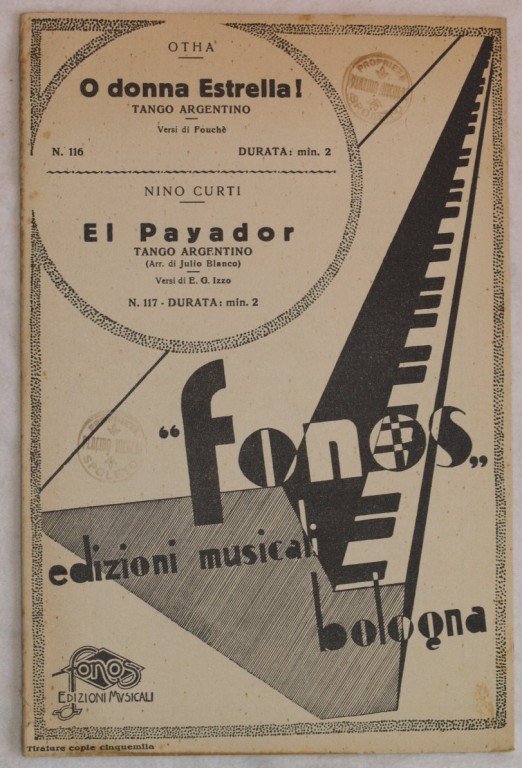 In 8. cm 26,5x17,5. Pp. 14. Partitura completa per orchestra del 1935 di due canzoni. Caratteristica copertina decorata dell'epoca. Ex libris sulla copertina. Ottime condizioni. A complete score for orchestra of 1935. Carachteristic decorated cover of that period. Ex libris in the cover. Very good conditions.