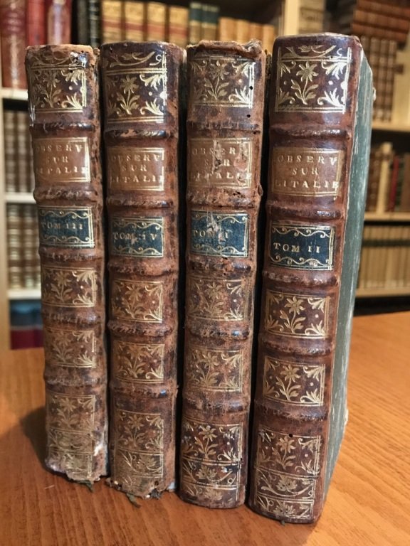 <span style="font-style: normal;">4 volumi in-12° (cm. 16,3), legature coeve in m. pelle con titolo e fregi in oro ai dorsi (lievi usure), tagli rossi; carte in ottimo stato; sporadiche fioriture, antichi appunti ai risguardi. Seconda edizione della relazione, aumentata rispetto alla prima apparsa in 3 volumi nel 1764, del viaggio di 8 mesi compiuto in Italia nel 1758 dal Grosley (storico, collaboratore dell'</span><i>Encyclopédie</i> e osservatore dei costumi dell'età dell'Illuminismo). E' un libro di successo che affronta molti temi (arte, politica, economia, musica, moda) e che racconta di moltissimi personaggi incontrati (Beccaria, Goldoni, Gaetana Agnesi, padre Martini, ecc.). Cfr. Barbier III, 617; Fossati-Bellani, 377. Buon esemplare. (SG5)