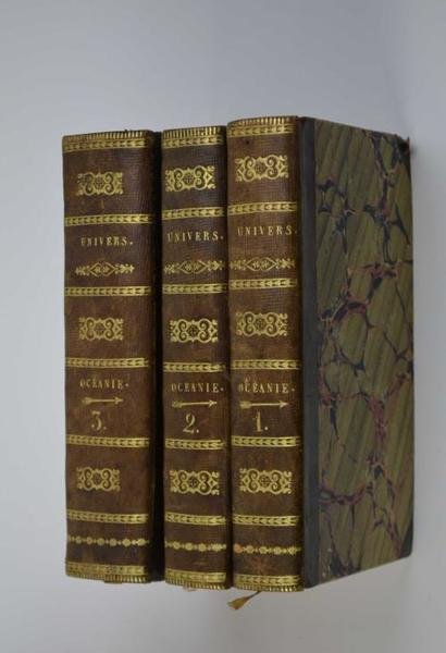 Tre volumi di cm. 21, pp. 1000 ca. complessive di testo + 309 tavole incise f.t. fra cui 5 carte geografiche ripiegate. Solida ed elegante legatura coeva in mezza pelle con punte, dorsi lisci con titoli e fregi in oro. Sguardie marmorizzate. Usuali fioriture dovute alla qualità della carta, ma esemplare complessivamente genuino e ben conservato.
