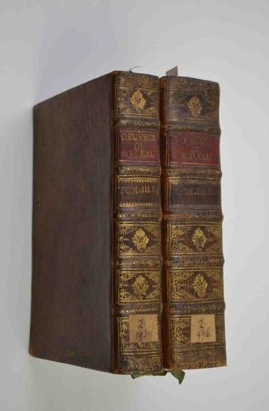 Quattro parti legate in due volumi di cm. 20, pp. (4) xxxviii (2) 138, 365; (4) 352; (4) 320; 267 (1). Ciascun frontespizio in rosso e nero con bella vignetta incisa centrale, antiporta allegorica al primo volume e 6 tavole fuori testo. Il tutto finemente inciso in rame. Solida ed elegante legatura coeva in piena pelle, dorsi a nervi con titoli e fregi in oro. Esemplari in ottimo stato di conservazione. Bell'edizione, non comune a trovarsi completa delle tavole che illustrano "le Luthrin". Edizione condotta su quella di Amsterdam del 1728. Cfr. Cohen 168.