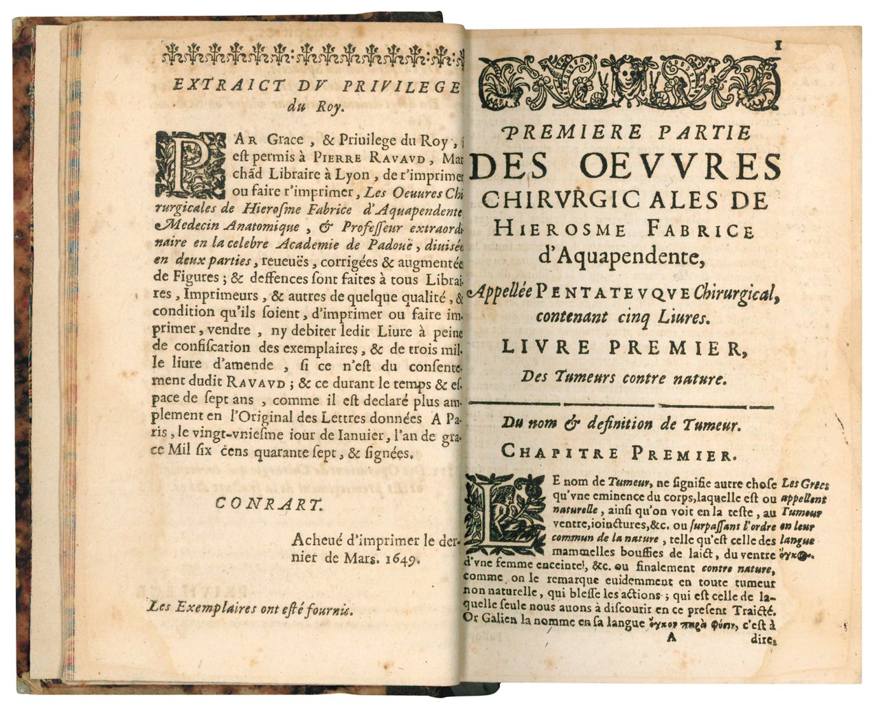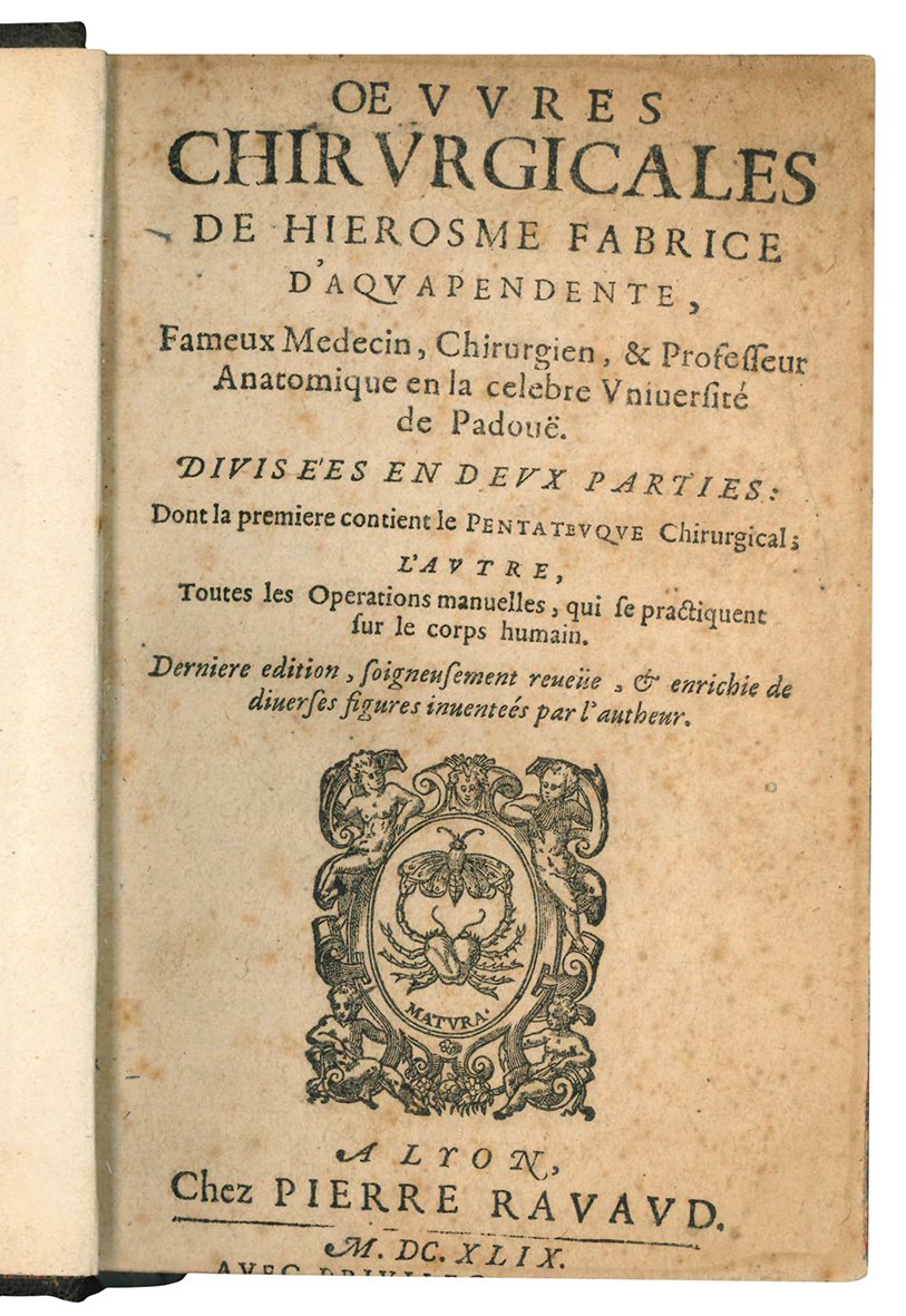 Oeuvres chirurgicales de Hierosme Fabrice d'Aquapendente, fameux medecin, ... Divisées en deux parties: Dont la premiere contient le Pentateuque Chirurgical; l'autre, toutes les Operations manuelles, qui se practiquent sur le corps humain. Derniere edition, soigneusement reveüe, & enrichie de diverses figures inventées par l'autheur.