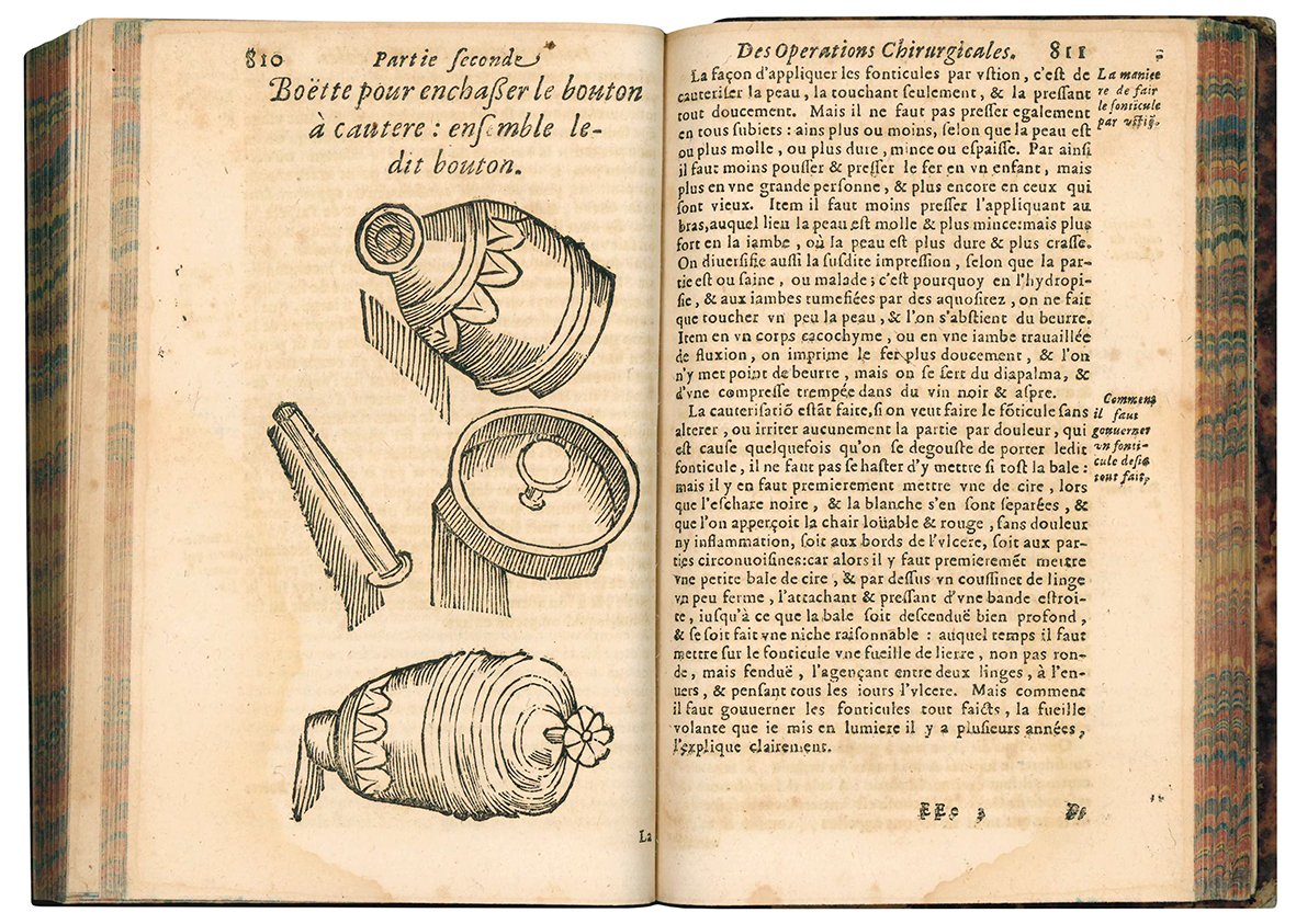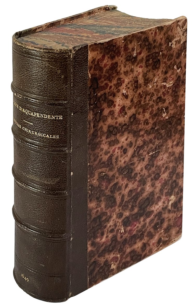 In 8vo (mm 160x103); pp. [16], 936 [i.e. 930], [22]. Segnatura: â⁸ A-Nnn⁸ Ooo⁴. Ripetute nella numerazione le pp. 465-466 e 679-680 e saltate le pp. 177-178 e 481-488. Marca tipografica al frontespizio raffigurante un granchio che tiene con le chele una farfalla entro cornice anch'essa xilografica. Dodici belle xilografie nel testo raffiguranti strumenti medici dell'epoca. Testatine, iniziali e finalini ornati. Frontespizio corto nel margine inferiore con perdita di testo, per il resto margini sobri. Aloni e fioriture diffuse. Mezzo marocchino ottocentesco, piatti rivestiti con carta colorata. Dorso a quattro nervetti con filetti impressi a secco e titolo in oro. Tagli e risguardi marmorizzati. Seconda edizione francese, dopo la prima pubblicata sempre da Pierre Ravaud a Lione nel 1643.