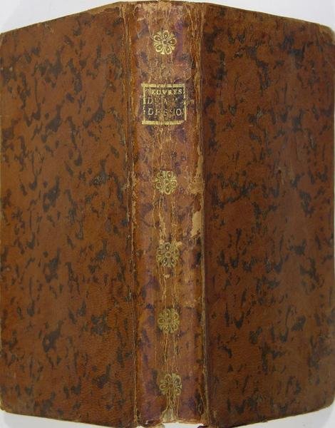 A Londres, s.n., 1780. In/12 reliure plein veau tacheté du temps, dos lisse à felurons dorés et pièce de titre, xij f., 108 p. & 107 p. Coiffe inférieure manquante, coins amortis et usés. Auréole claire sur la partie centrale de l'ouvrage sur la moitié des feuillets. Madame Antoinette Deshoulières (1634-1694) était liée à Pierre et Thomas Corneille, à Esprit Fléchier, Jules Mascaron, Paul Pellisson, etc. Ses contemporains la surnommèrent la « Dixième Muse », la Calliope française. Antoinette Deshoulières s'essaya dans presque tous les genres, depuis la chanson jusqu'à la tragédie ; mais elle réussit surtout dans l'idylle et l'églogue. Élue à l'Académie des Ricovrati en 1684 et à l'Académie d'Arles en 1689, elle est la toute première femme académicienne en France.