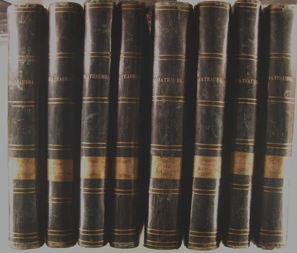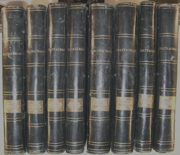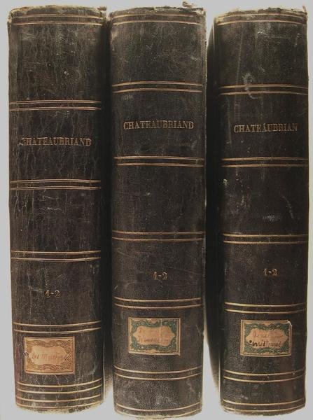 Paris, Eugène et Victor Penaud frères éditeurs, s.d. (1849-1850). 14 volumes in/8 reliure demi-basane vert bouteille, dos lisse à filets et titres doré, 11 volumes avec des étiquettes, 72 planches hors-texte dessinées par Staal, Moraine et Gagniet, gravées par Delannoy, certaines sur chine contrecollées. Mémoires d’outre-tombe : (6 tomes en 3 vol. ) 2 ff., 431 p. - 2 f., 443 p. - 2 f., 431 p., 2 f., 436 p.- 2f., 455 p. - 2 f., 464 p. ; 23 planches ; Génie du Christianisme : (2 tomes en 1 vol.) 3 f., 443 p. - 2 f., 397 p. ; 7 planches ;Les martyrs : (2 tomes en 1 vol.) 2 f., 414 p. - 2 f., 427 p., 2 f. ; 8 planchesItinéraire de Paris à Jérusalem : (2 tomes en 1 vol.) 2 f., 437 p., 1 f. - 2 f., 431 p. ; 3 planches ;Congrès de Vérone - Guerre d’Espagne suivie de Vie de Rancé : 507 p. ; 2 planches ;Études historiques : 599 p. ; 4 planches ; Essai sur la littérature Anglaise suivi de Le paradis perdu de Milton : 488 p. ; 5 planches ; Analyse raisonnée de l’histoire de France : 2 f., 600 p. ; 5 planches ; Politique, opinions et discours - Polémique : 511 p.Les Natchez : 2 f., 381 p., 1 f. ; 3 planches ; Mélanges historiques : suivi des mélanges politiques : 2 f., 491 p. ; 3 planches ; Atala - René - Les aventures du dernier Abencerage - Les quatre Stuarts - Le Mont Blanc : 394 p. ; 5 planches. Larges rousseurs claires éparses sur l’ensemble des volumes. Coiffes supérieures abîmées sur le vol. 1 d’Outre tombe et du Congrès de Vérone. Génie du Christianisme : petite galerie d’insecte en coiffe supérieure. complet de la liste des souscripteurs François-René, vicomte de Chateaubriand, né à Saint-Malo le 4 septembre 1768 et mort à Paris le 4 juillet 1848, écrivain romantique et homme politique français. Il est considéré comme l'une des figures centrales du romantisme français.