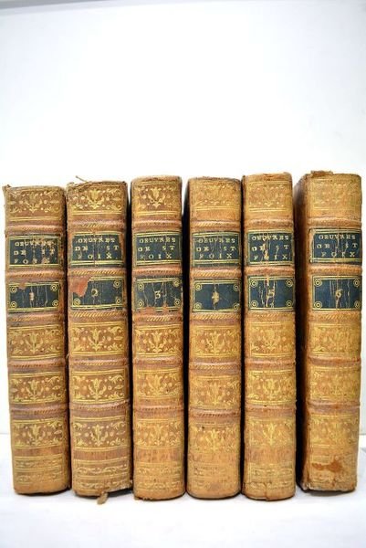 in-8. 6 tomes en 6 volumes. 1 feuillet. Portrait. 2 feuillets. 592 pages. 1 gravure hors-texte. + 1 feuillet. Frontispice. 1 feuillet. 600 pages + 2 feuillets. 479 pages. + 2 feuillets. 463 pages. + 2 feuillets. 472 pages. + 2 feuillets. 524 pages. (20x12,5cm). Plein veau ancien. Dos à nerf orné. Pièces de titre et tomaison. Tranches et gardes marbrées. Quelques frottements et épidermures aux reliures. Quelques petits accidents aux coiffes et dos. Coins un peu émoussés. Quelques rousseurs. Quelques mouillures sans gravité (plus prononées, mais sans perte, au tome 3). Très bon état intérieur. Tomes I et II: Théâtre et les Lettres turques. Tomes III, IV et V: Essais historiques sur Paris. Tome VI: Histoire de l'ordre du Saint-Esprit. Avec le portrait de l'auteur, une gravure hors-texte (tome 1) et un frontipice (tome 2). Exemplaires solides, très bon état intérieur. Poullain de Saint-Foix (1698-1776), d'esprit très querelleur, fut autant connu pour ses duels que pour ses productions littéraires ; il fut nommé en 1764 historiographe de l'ordre du Saint-Esprit.