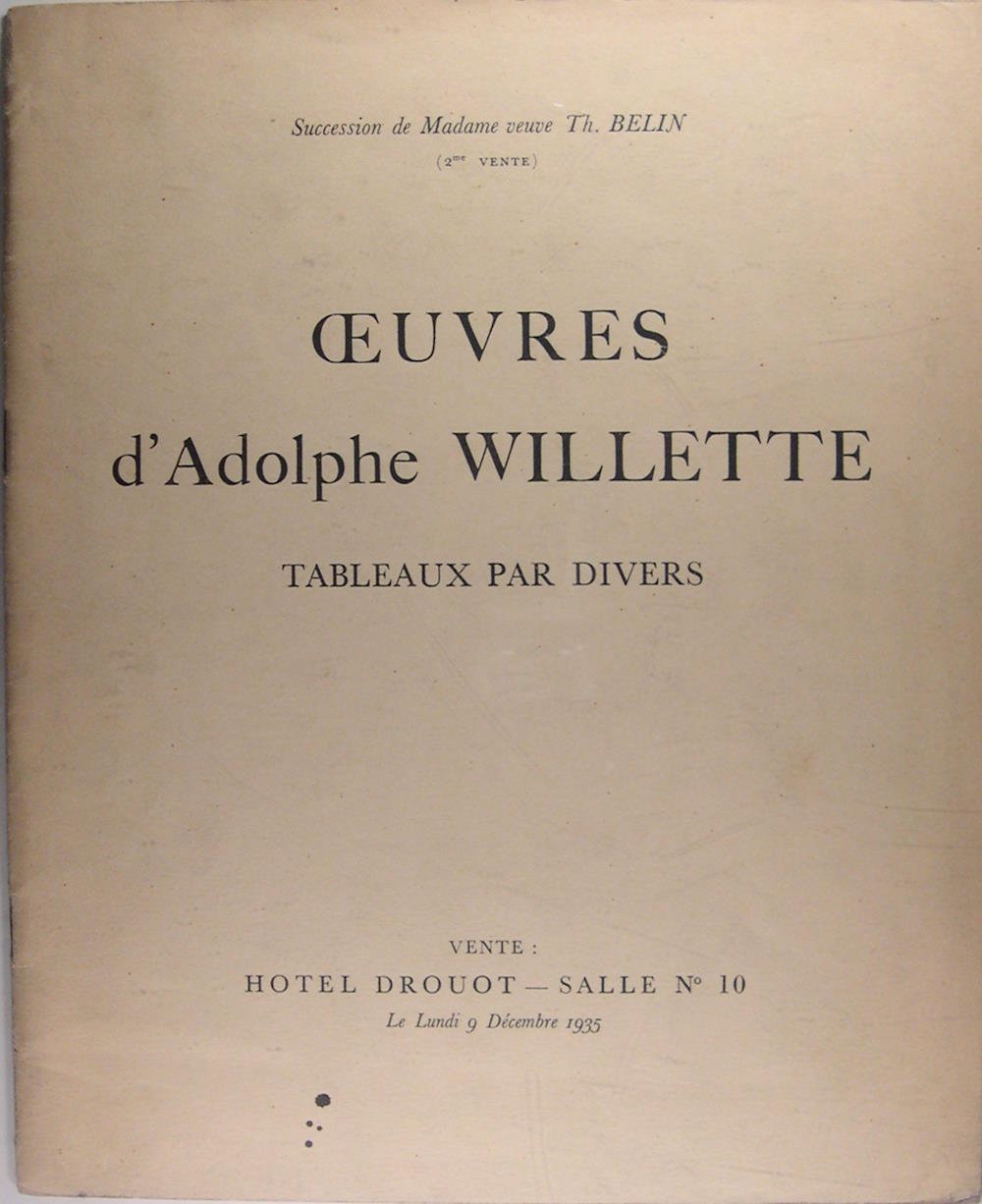 Hôtel Drouot, 1935. Plaquette in/4 (27 x 22 cm) brochée, couverture imprimée, illustrations en noir, 15 pages, 77 lots (prix finaux écrits en marge) Tableaux, aquarelles, pastels, dessins, vitrail par A. Willette, tableaux par Dantan, Detroy, Grandsire, Garnier, de Los Rios, G. Marquet, G. Picard.
