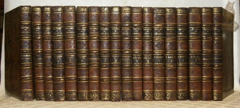 Oeuvres de Jacques Delille. 18 titres. 1. L’homme des champs, ou les Géorgiques françoise. 2. Les jardins, poëme. Nouvelle édition. 3. La pitié, poëme. 4, 5 et 6. Paradis perdus (de John Milton), traduit par Jacques Delille, tome premier, tome deuxième et tome troisième. 7. Les bucoliques de Virgile, traduites en vers français. 8 et 9. L’imagination, poëme, tome premier et tome deuxième. 10. Poésies fugitives. Nouvelle édition, augmentée d’un grand nombre de pièces inédites suivie du Dithyrambe sur l’immortalité de l’ame, et de la traduction du passage du Saint-Gothars, poème. 11 et 12. Les trois règnes de la nature, avec des notes, par M. Cuvier, et autres savants. Tome premier et tome deuxième. 13, 14,15 et 16. L’Enéide, traduite par