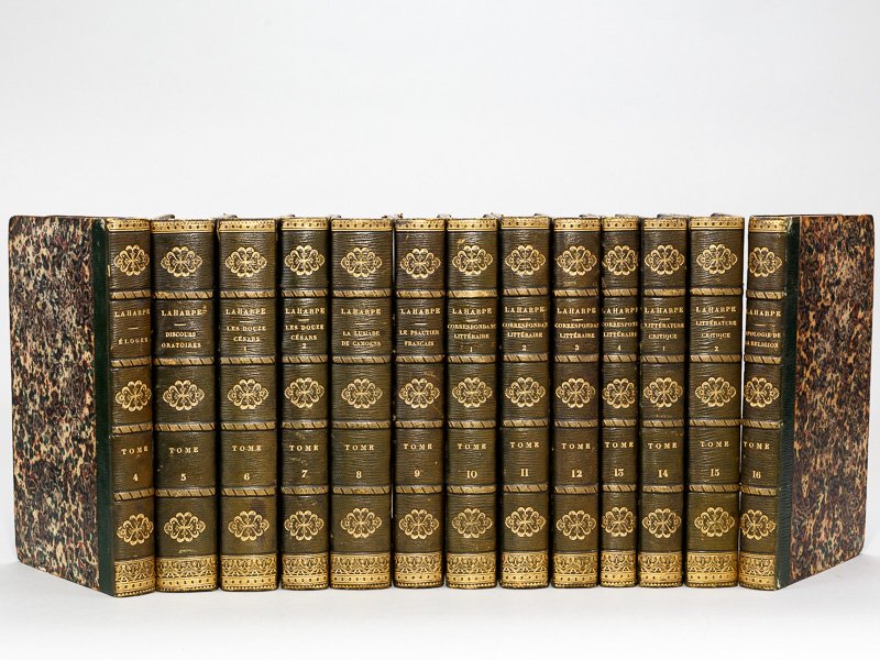 Rappel des titres : Oeuvres de La Harpe (Tomes 4 à 16) Tome 4 : Eloges ; 5 : Discours oratoires ; 6 et 7 : Les douze Césars ; 8 : La Lusiade de Camoëns ; 9 : Le Psautier Français ; 10, 11, 12 et 13 : Correspondance Littéraire ; 14 et 15 : Littérature et Critique ; 16 : Fragments de l'Apologie de la Religion Bien qu'incomplet des trois premiers volumes, un bel ensemble très bien relié et très décoratif. Prix de l'ensemble, en l'état