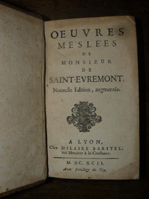 In-12°, pp (4), 506,(6), legatura coeva in piena pelle, dorso a cinque nervi con titolo su tassello e fregi in oro. Saint-Évremond, Charles de Marguetel de Saint-Denis signore di. Scrittore francese (castello di Saint-Denis-le-Guast, Coutances, 1616 - Londra 1703); ufficiale, combatté in varie campagne, ma la scoperta di un libello contro la politica di Mazzarino lo costrinse a prendere la via dell'esilio, che trascorse quasi per intero in Inghilterra; né volle lasciare Londra allorché Luigi XIV accondiscese al suo rimpatrio. Spirito vivace, acuto, brillante, può considerarsi un epigono dei 'libertini eruditi' della prima metà del sec. 17º; si caratterizzò per il suo atteggiamento scettico, la sua polemica antistoica e antiascetica, il suo gusto per la vita mondana; la sua produzione saggistica rispecchia la varietà dei suoi interessi e la sua attenzione soprattutto a problemi di costume. I suoi scritti si diffusero in varie edizioni di Oeuvres meslées
