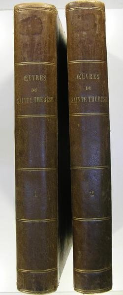 Abbé M**** éditeur, Paris, 1840. 2 volumes in-4 (27 x 18 cm) reliure demi-basane havane, dos lisses à filets et titres dorés, frontispice (portrait de Sainte Thérèse), fac-simile de son écriture, 732 pages, 702 pages. Lettres inédites traduites par Arnaud D'Andilly, Rousseurs éparses. Sainte Thérèse d'Ávila, 1515 - 1582, religieuse espagnole, réformatrice de l'Ordre du Carmel au XVIe siècle, sainte et docteur de l'Église. Profondément mystique, elle laisse des écrits sur son expérience spirituelle qui la font considérer comme une figure majeure de la spiritualité chrétienne.