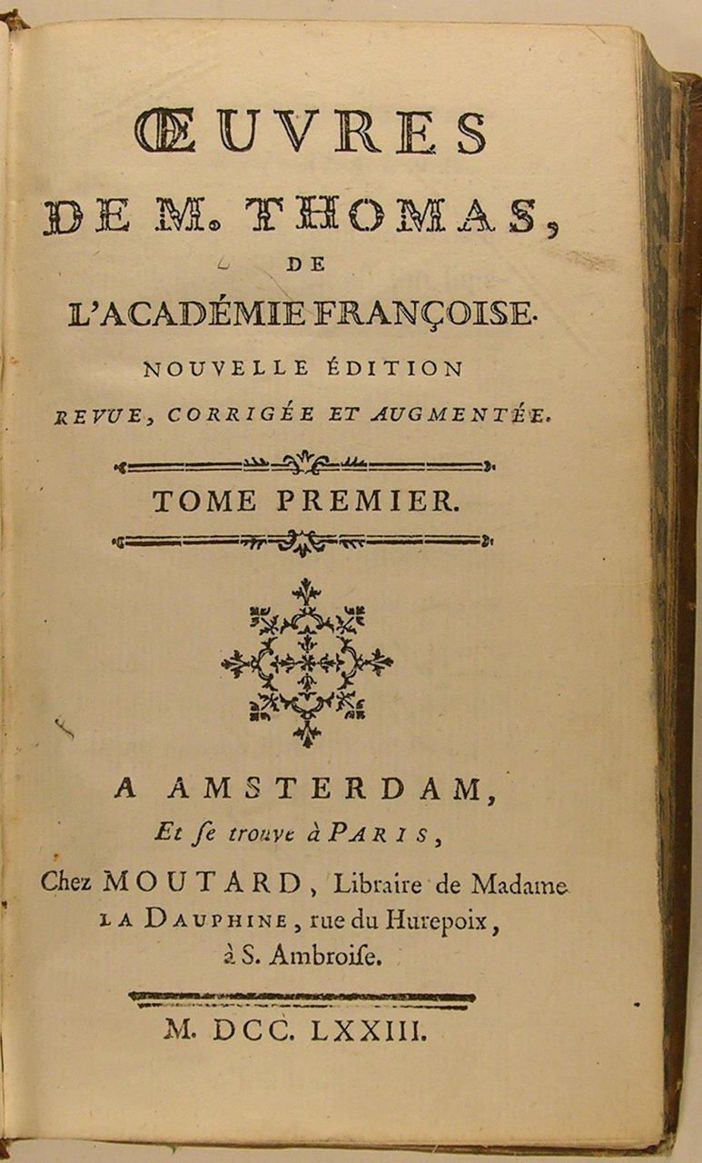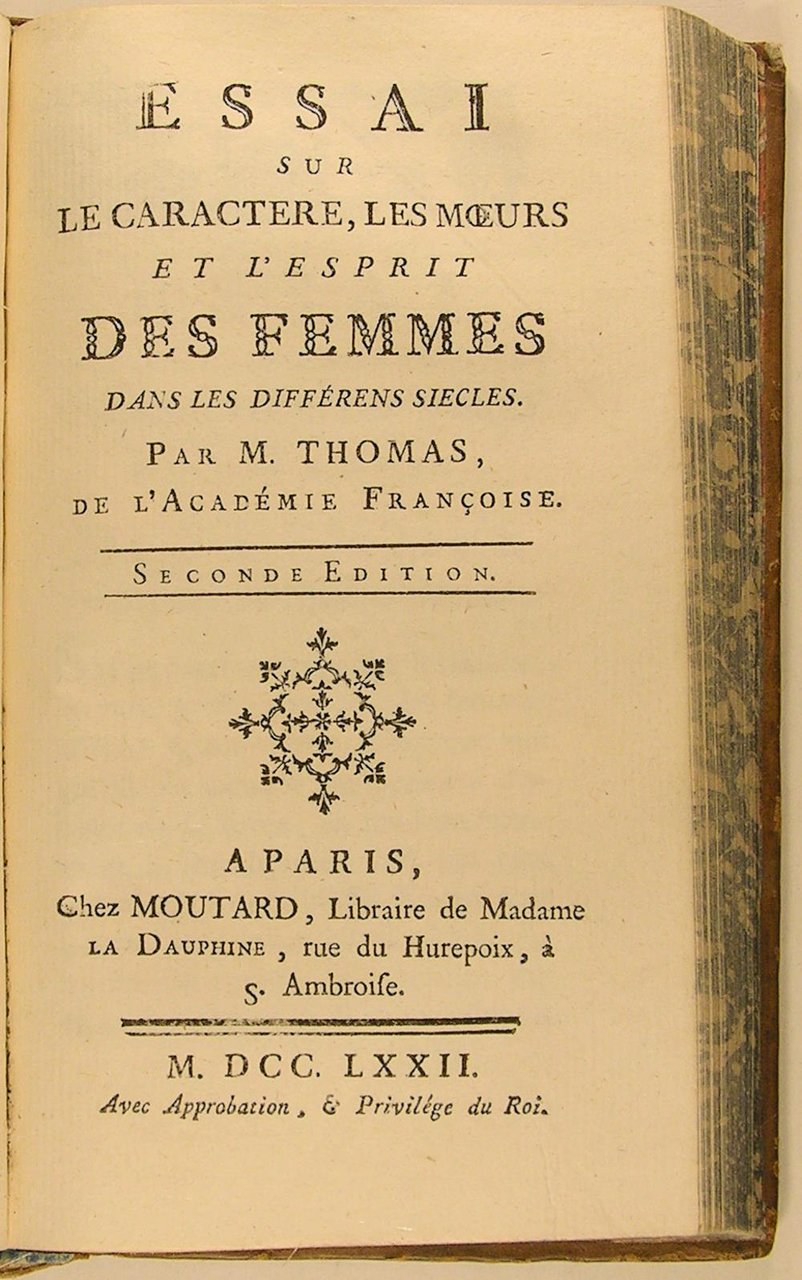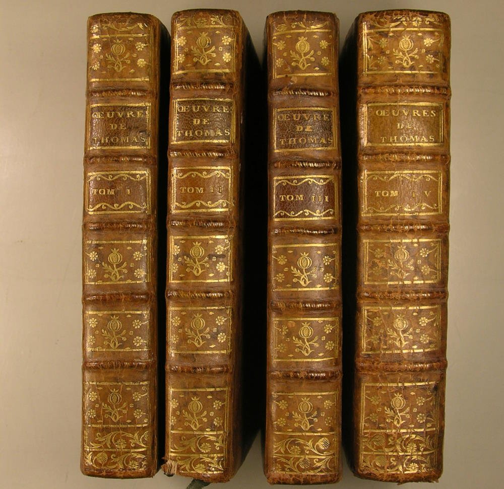 A Amsterdam, chez Moutard, librairie de madame la Dauphine, rue Hurepoix, à S. Amboise, 1773, nouvelle édition, revue, corrigée et augmentée. Quatre volumes in/12, dans une reliure d'époque en pleine basane marbrée, dos ornés à nerfs, tranches jaspées. Tome I : 426 pages ; Tome II : 410 pages ; Tome III: 433 pages. Tome IV : Essai sur le caractère, les moeurs et l'esprit des femmes, seconde édition 1772, 371 pages, 214 pages. "Antoine Léonard Thomas, né le 31 octobre 1734 à Clermont-Ferrand et mort le 31 décembre 1785 à Oullins, poète, critique littéraire et académicien français, surtout renommé en son temps pour sa grande éloquence."