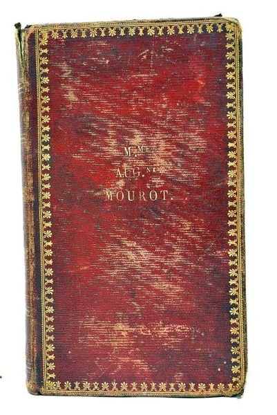 in-12. 1 feuillet. 583 pages. (17x10cm). Plein maroquin. Dorures, dentelles, dos lisse orné. Tranches dorées. Reliure frottée. Coins émoussés. Petits manques. Rousseurs, fortes par endroits. Bon état. En lettres dorées sur le premier plat : "M.me Aug.ne Mourot". Imprimé à Tours. Belle reliure en maroquin, un peu fanée.