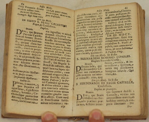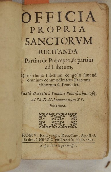 In 24. Dim. 14x8 cm. Pp. 210+(6). Bella edizione del 1682 di questo officio dei Santi ad uso dei frati minori di San Francesco. Nella prima parte officia sanctorum con le lodi e orazioni dei Santi per ogni mese dell'anno. I Santi: Francesco Salesio, Ludovica Albertona, Andrea Corsini, Apollonia, Coleta, traslazione Santa Rosa Vergine, Caterina, Giuseppe, Monica, Pietro Celestino Papa, Bernardino da Siena, MAria Maddalena de Pazzi, MArgherita, Giovanni Gualberti, Francesco Solani, Santa Chiara Vergine, Francesco Borgia, Pietro da Alcantara, Gavino, Barbara ecc. Alcune antiche note manoscritte. Bella legatura in piena pergamena coeva. In buone condizioni. Copertina in piena pergamena coeva in discrete condizioni generali con usure e parti mancanti ai piatti, margini e dorso. Fori di tarlo (vedere foto). Legatura in buone condizioni. Pagine in buone condizioni con fioriture. Mende. Piccolo foro di tarlo da pag. 171 alla fine con perdita di qualche porzione di lettera. Lieve gora d'umidità marginale. Edition of 1682 of this Office of Saints. In the first part officia sanctorum with odes and orations of Saints for each month of the year.<BR>The Saints: Francesco Salesio, Ludovica Albertona, Andrea Corsini, Apollonia, Coleta, traslazione Santa Rosa Vergine, Caterina, Giuseppe, Monica, Pietro Celestino Papa, Bernardino da Siena, MAria Maddalena de Pazzi, MArgherita, Giovanni Gualberti, Francesco Solani, Santa Chiara Vergine, Francesco Borgia, Pietro da Alcantara, Gavino, Barbara etc. Some handwritten notes. Beautiful full parchment coeval cover. In good conditions. Full parchment coeval cover in good general conditions with wearings and missing parts in the plates, edges and spine (see the photo). Binding in good conditions. Inside pages are in good conditions with foxings. Usage signs. Little worming from pag. 171until the end with loss of some portion of letter. Slight water stain in the edges.