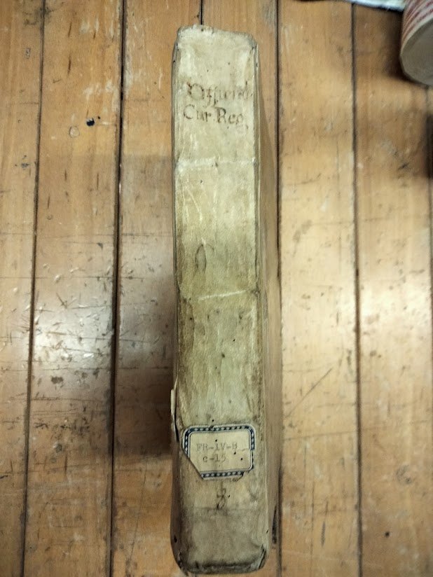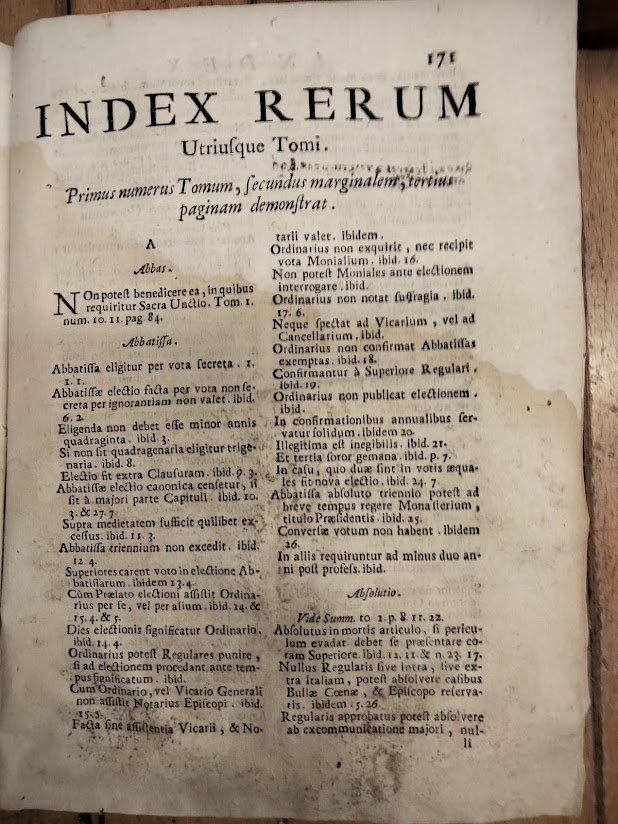 2 tomi in 1 vol. , in 8°, p. perg. , cc. nn. 6 + pp. 279 (1° tomo) + 186 (2° tomo). Mende alla cop. al d. ed al front. Gore che, tuttavia, non ledono il t. Evidenti tracce di ex umidità. Antichi forellini che interessano diverse lettere.