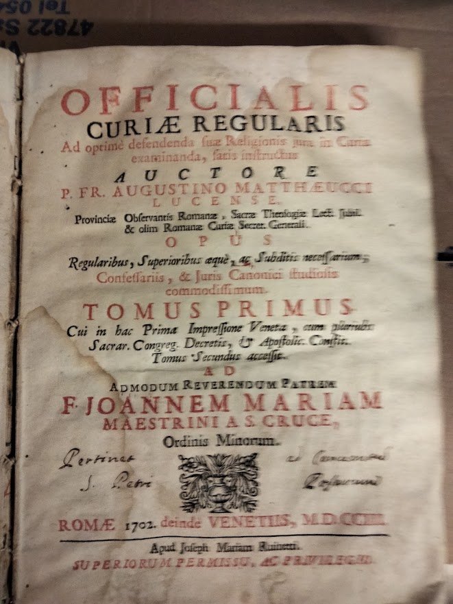 Officialis Curiae Regularis ad optimè defendenda suae Religionis jura in Curia examinanda, fatis instructus. Opus Regolaribus, Superioribus aequè, ac Subditis necessarium, Confessariis & Juris canonici studiosis commodissimum. Romae 1702 deindè.