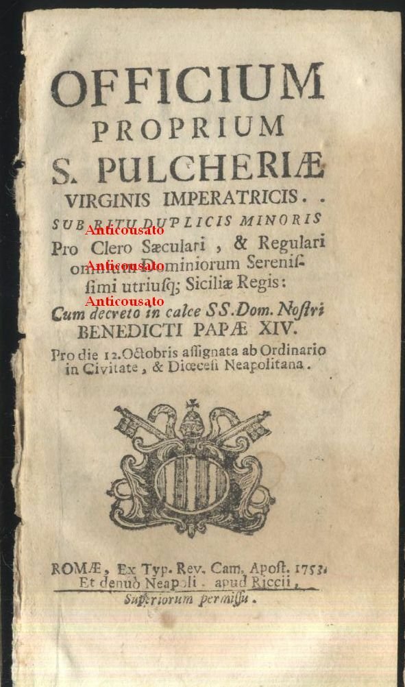 Officium proprium S. Pulcheriae Virginis imperatricis sub ritu duplicis minoris. Pro clero saeculari, et regulari omnium dominiorum serenissimi utriusque; Siciliae Regis (...)